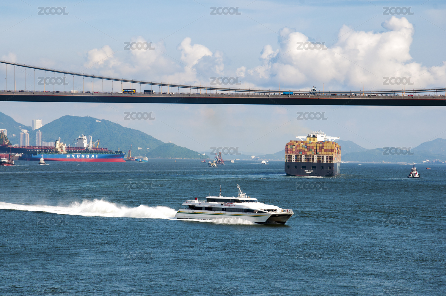 中國香港青馬大橋風(fēng)光和繁忙航運(yùn)水道