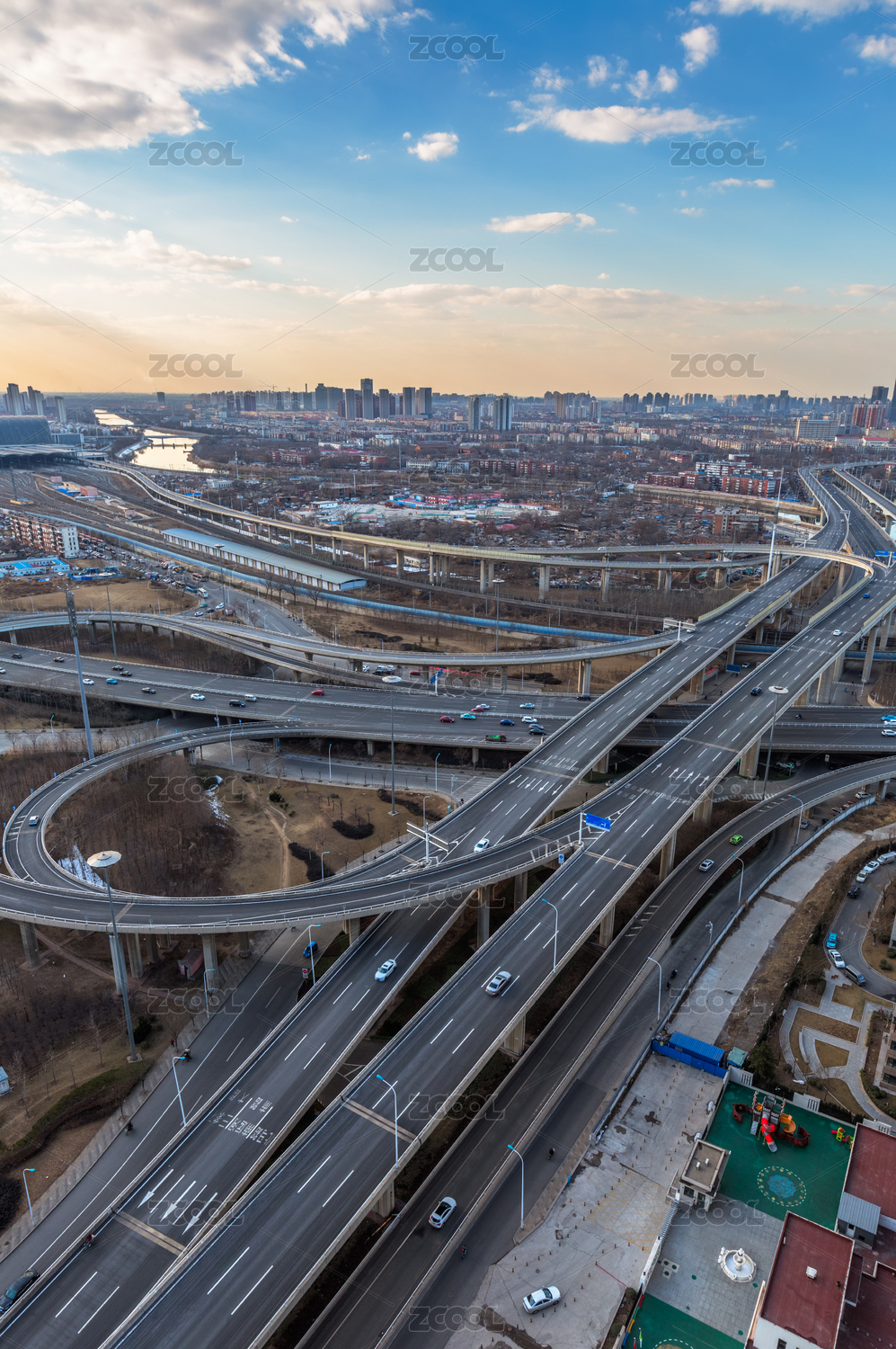 在上海,中國繁忙的立交橋與城市景觀的鳥瞰圖。