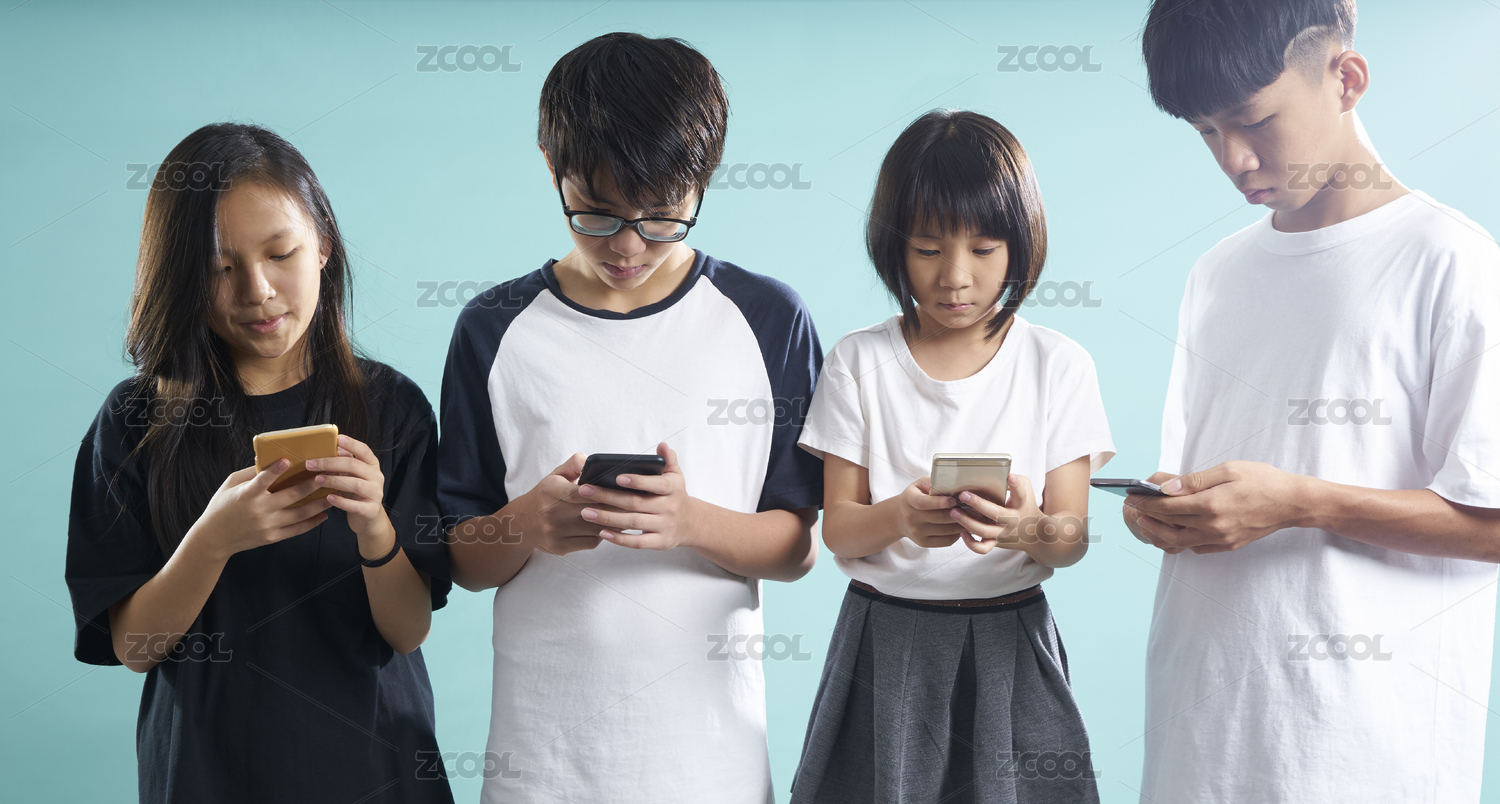 男女孩子們沉迷于手機(jī),現(xiàn)代化手機(jī)癮概念圖。
