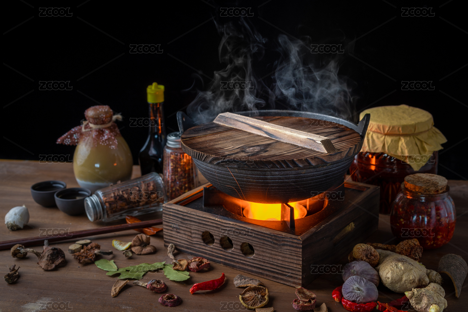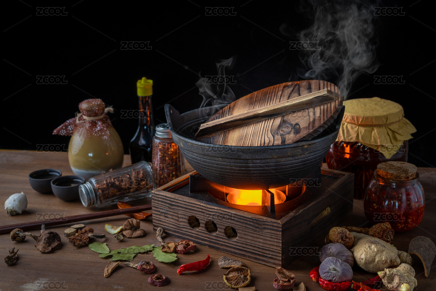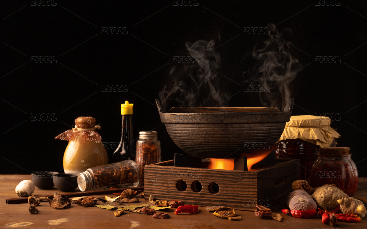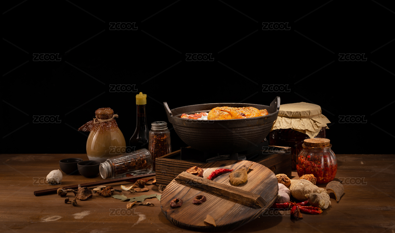 在黑色背景木質(zhì)桌面上用鐵鍋烹飪及多種干貨配菜