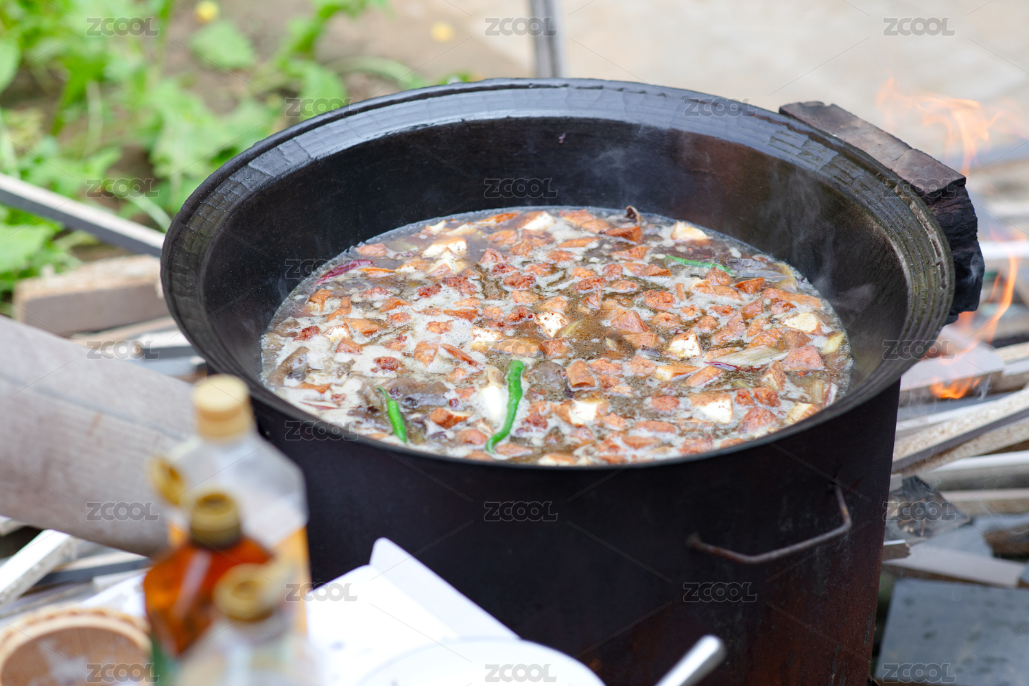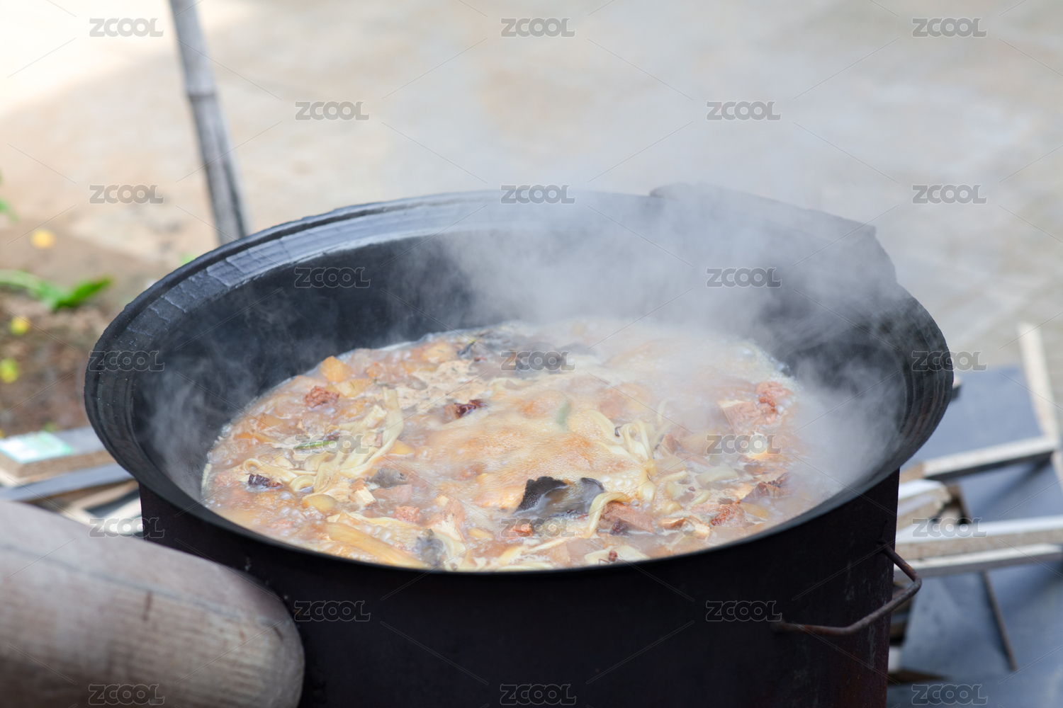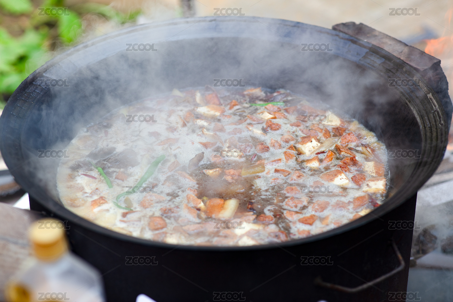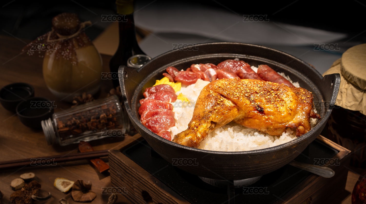 在黑色背景木質(zhì)桌面上用鐵鍋烹飪及多種干貨配菜