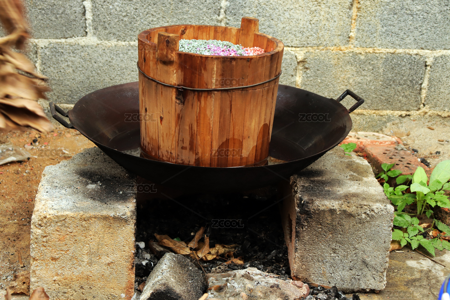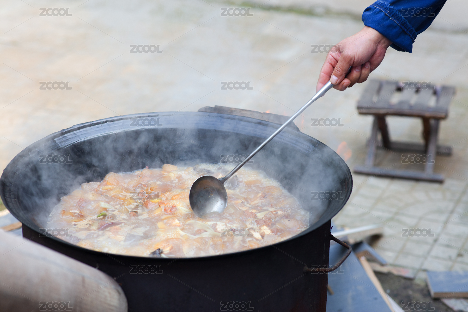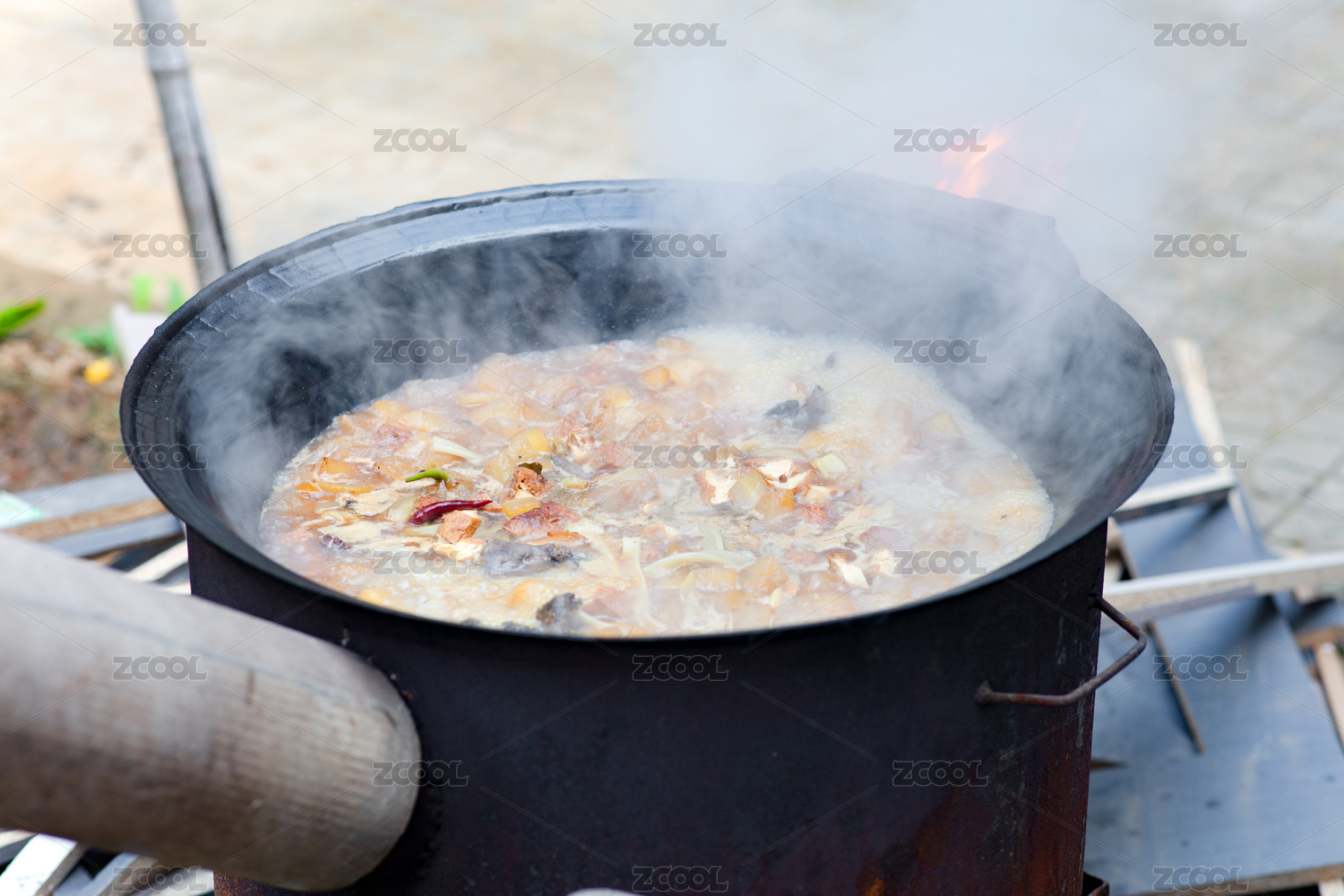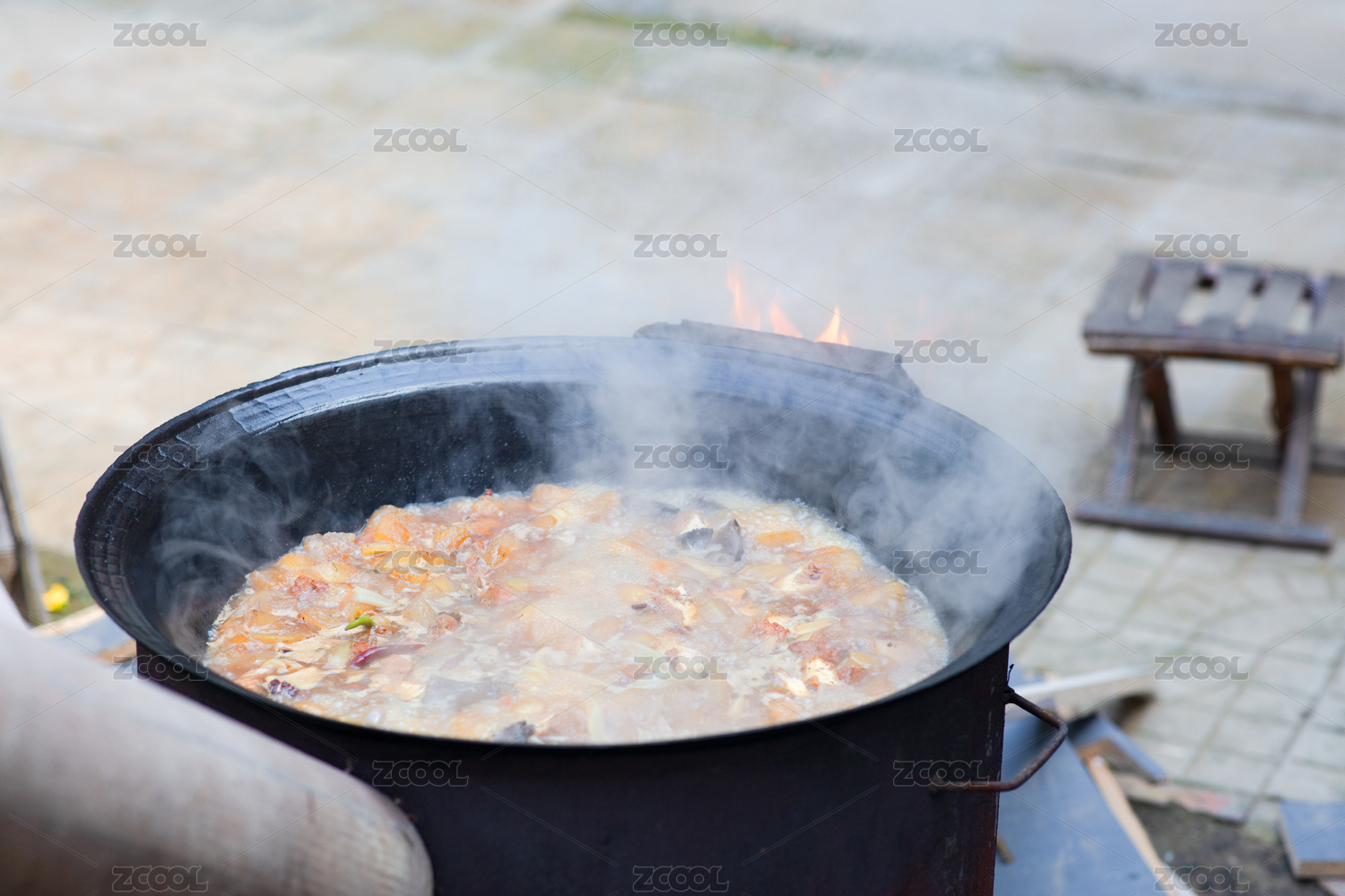 在黑色背景木質(zhì)桌面上用鐵鍋烹飪及多種干貨配菜