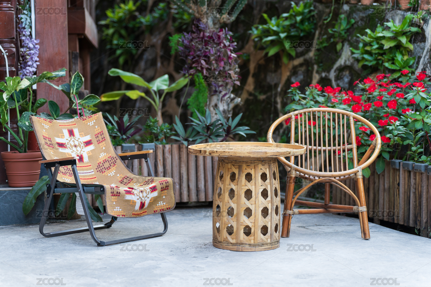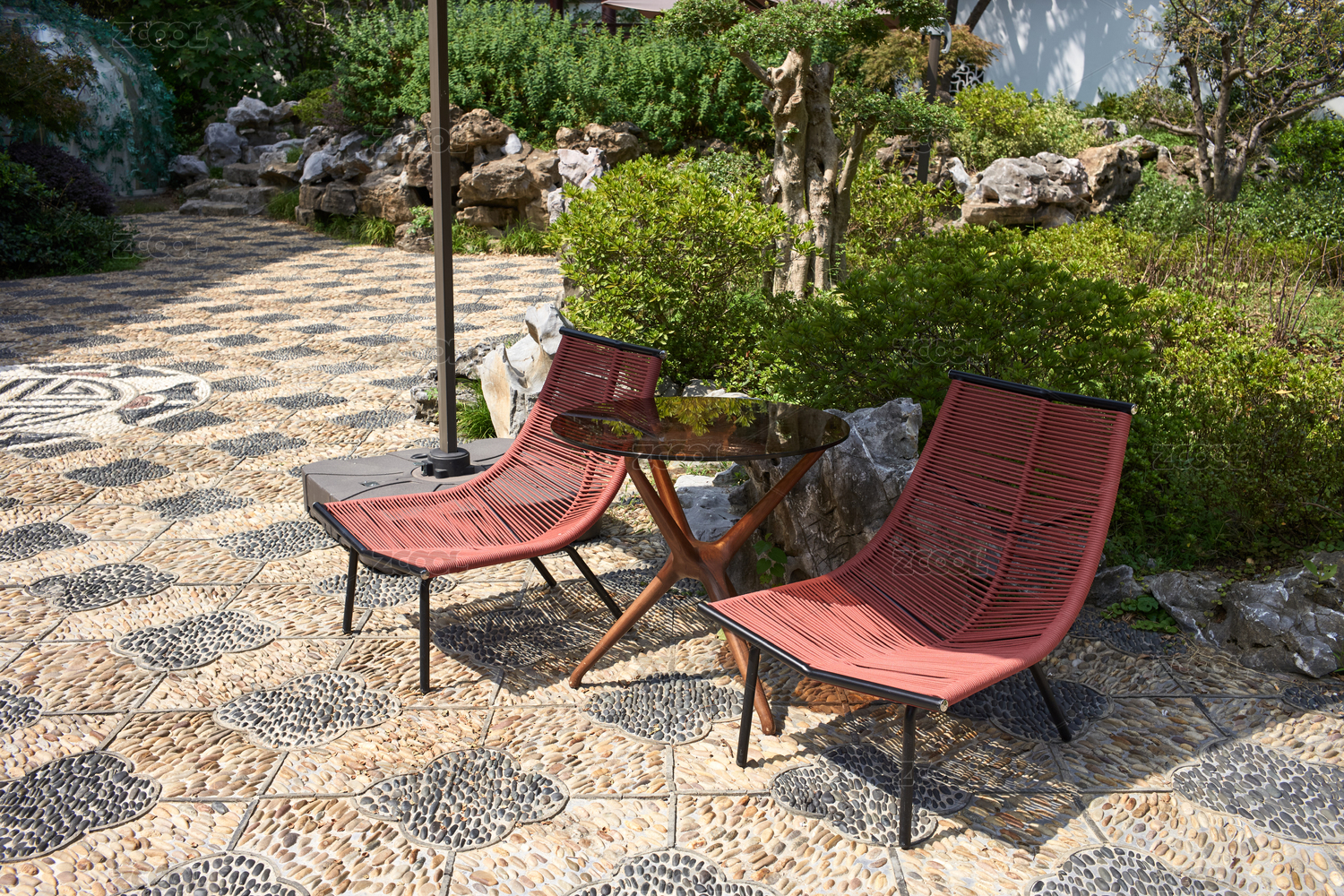 綠蔭環(huán)繞的兩把鐵紅色休閑藤椅