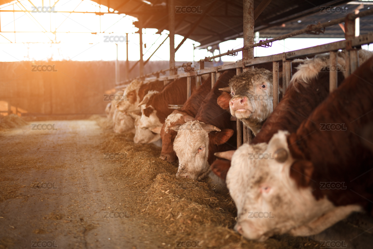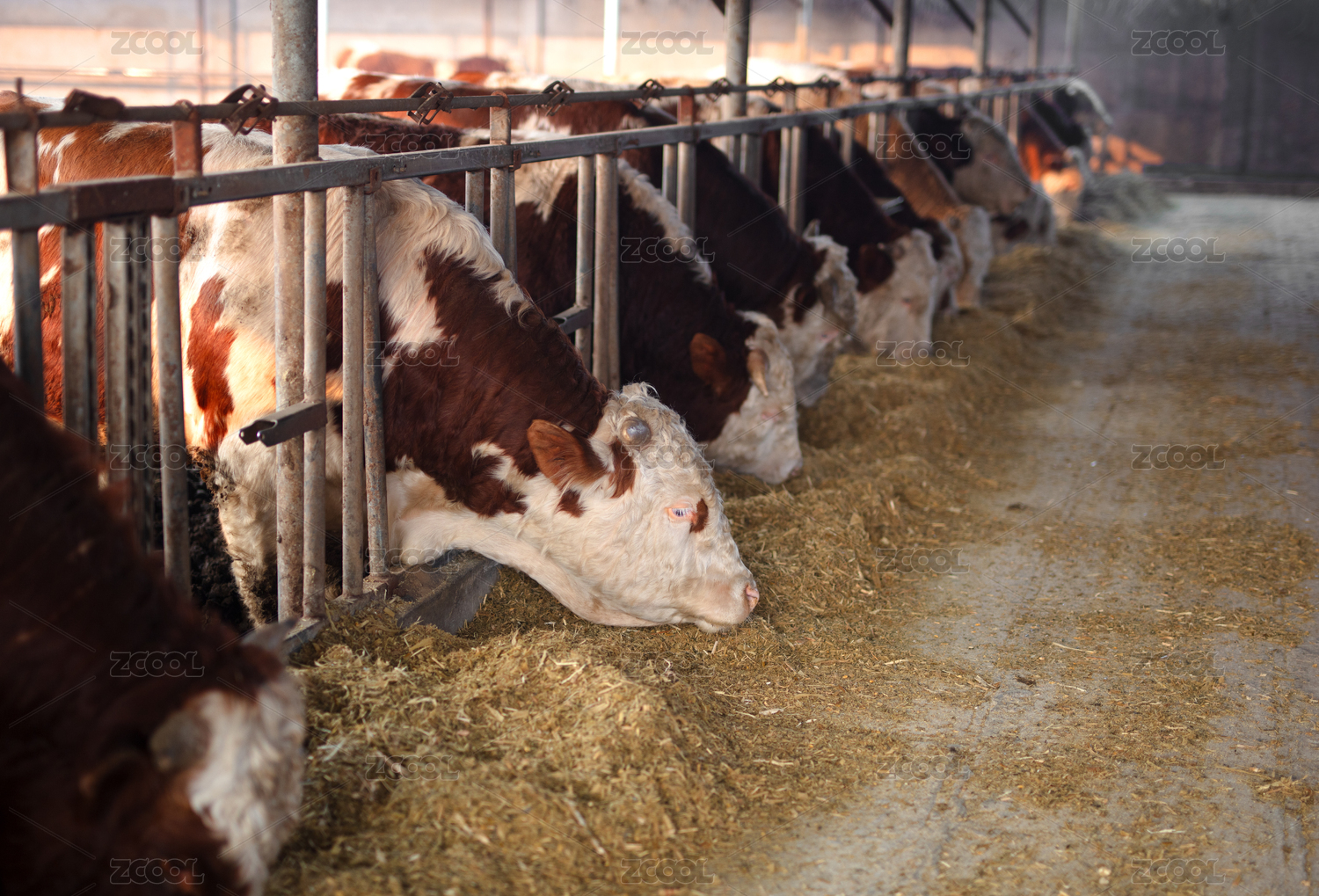 養(yǎng)牛場牛欄里的牛在吃飼料