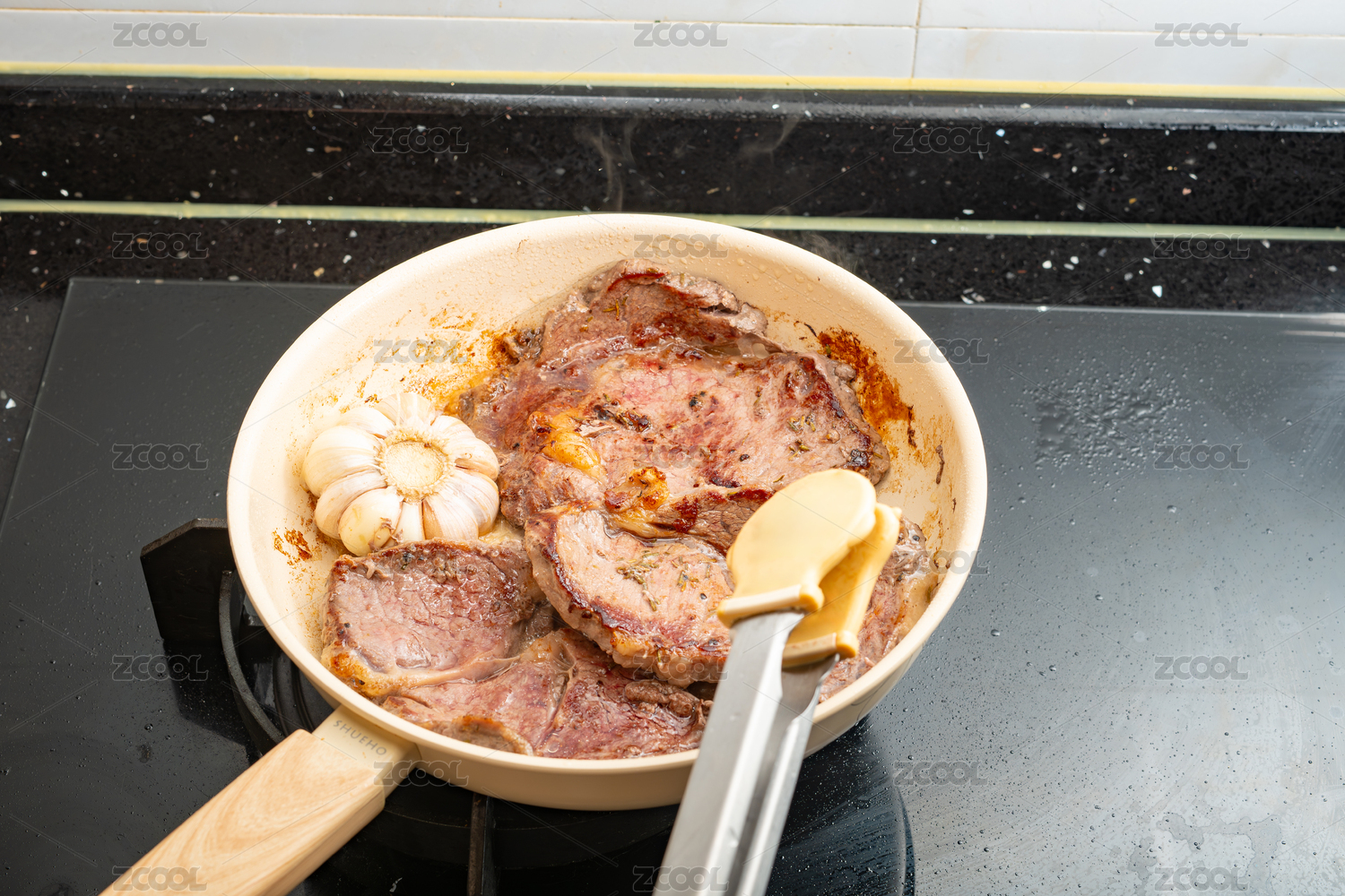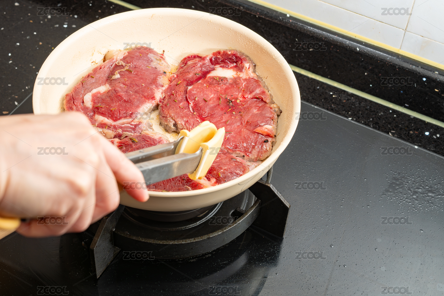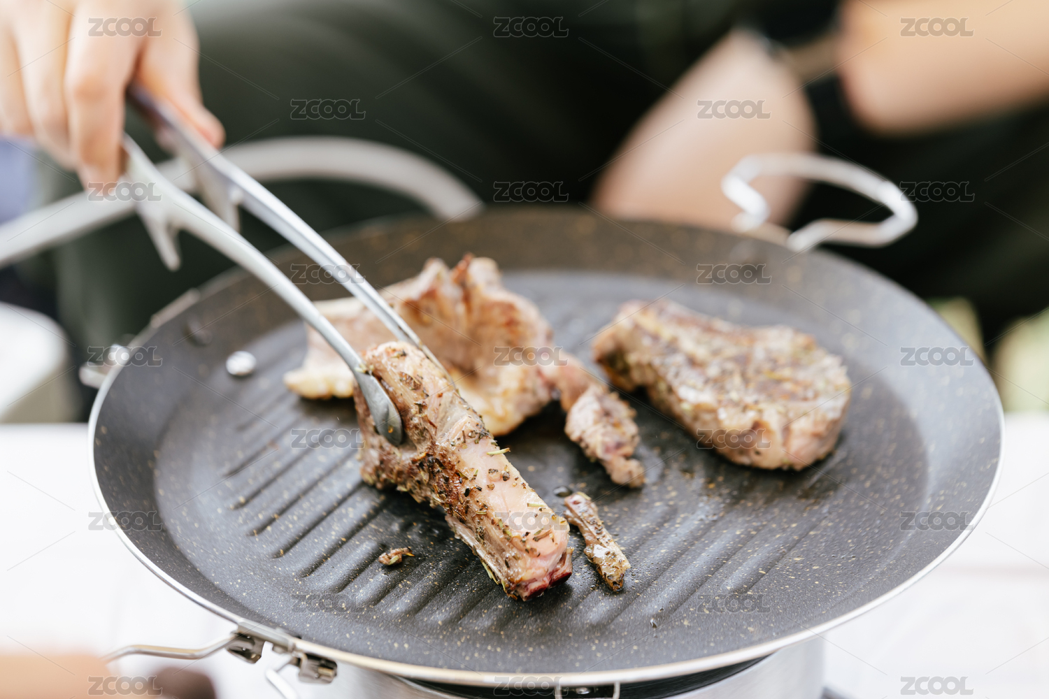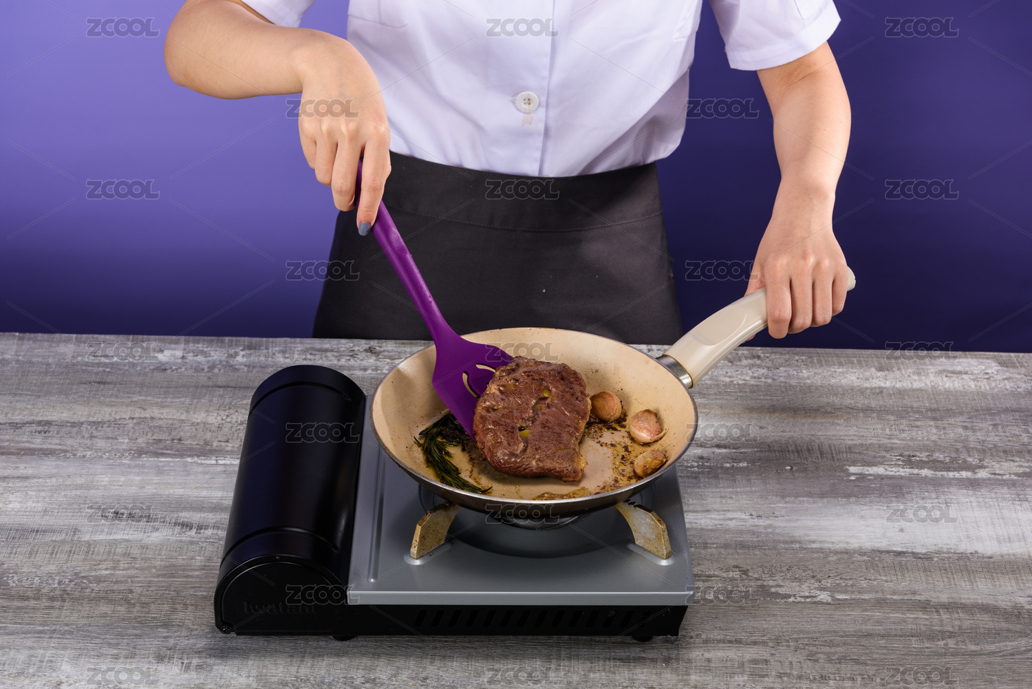 用紫色硅膠鏟在卡式爐灶上煎牛排
