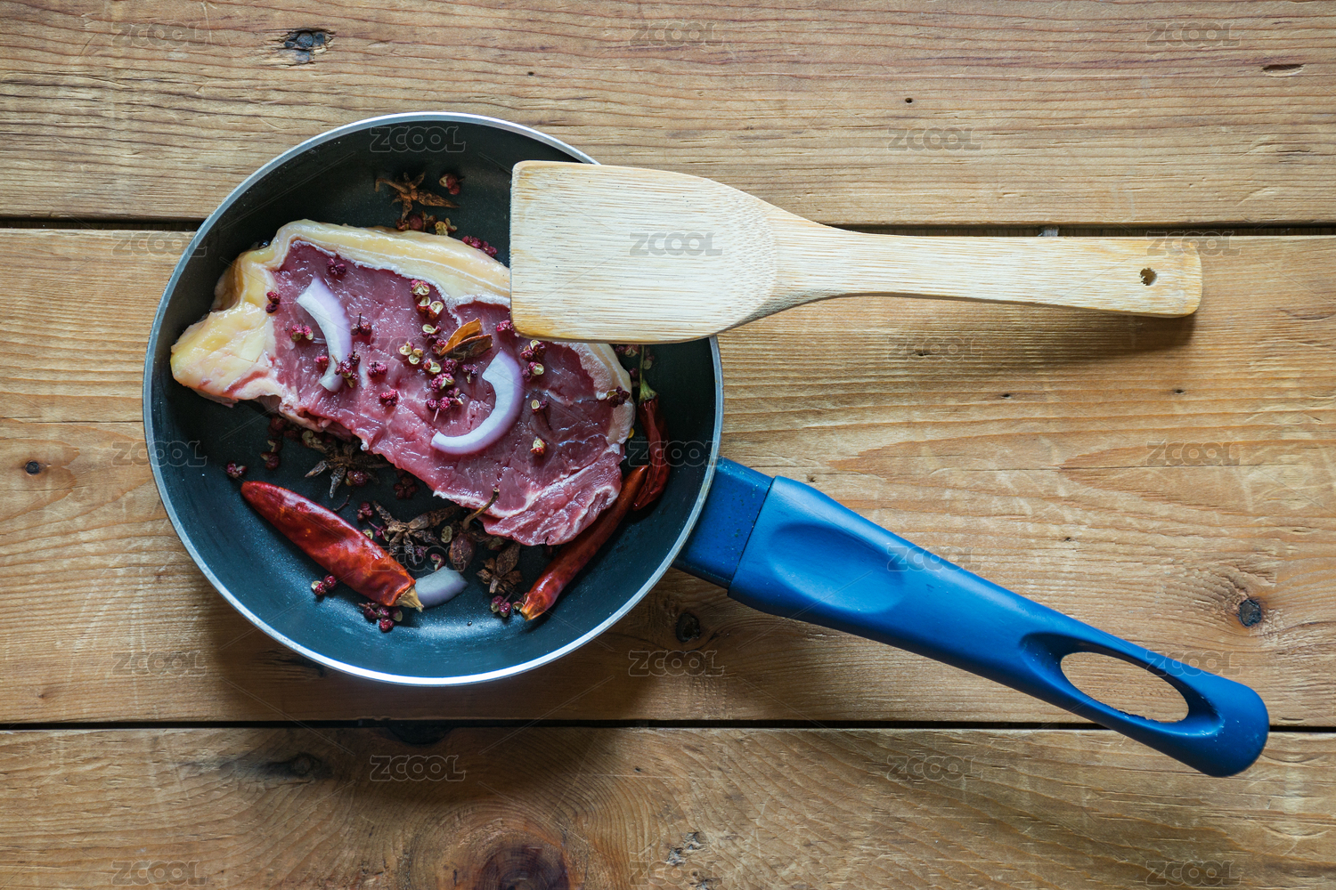用紅色硅膠鏟在卡式爐灶上煎牛排