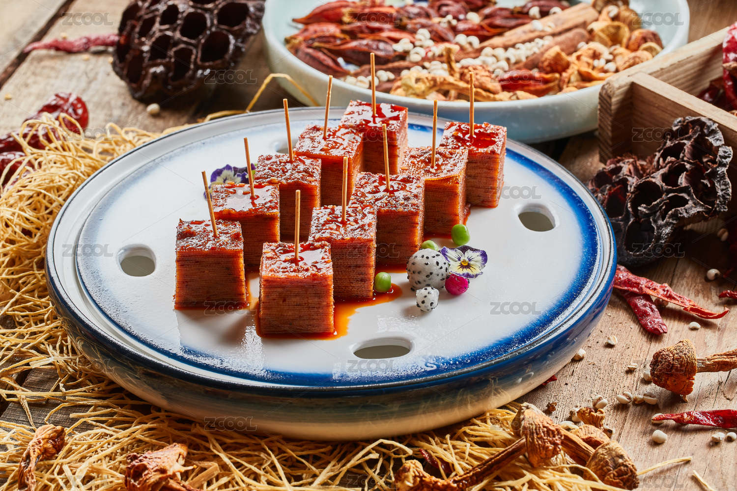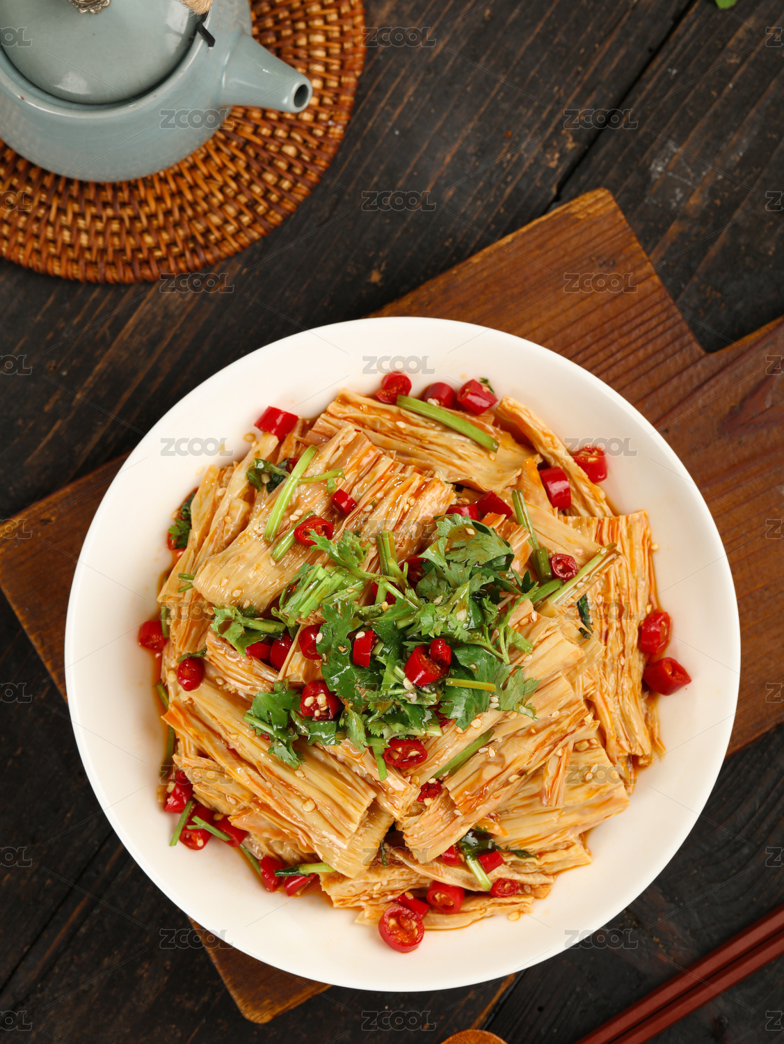 木紋桌面上的紅油干豆腐