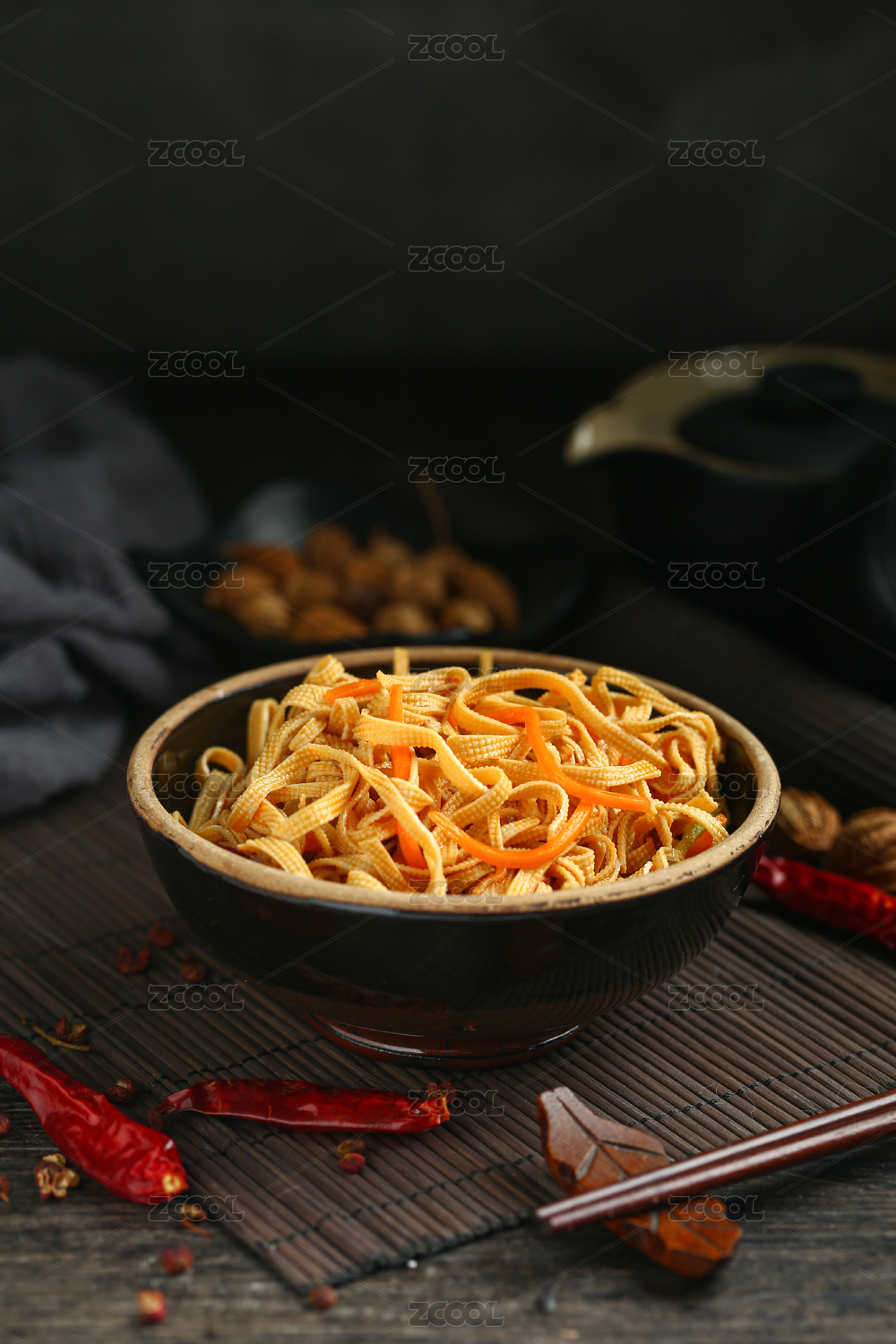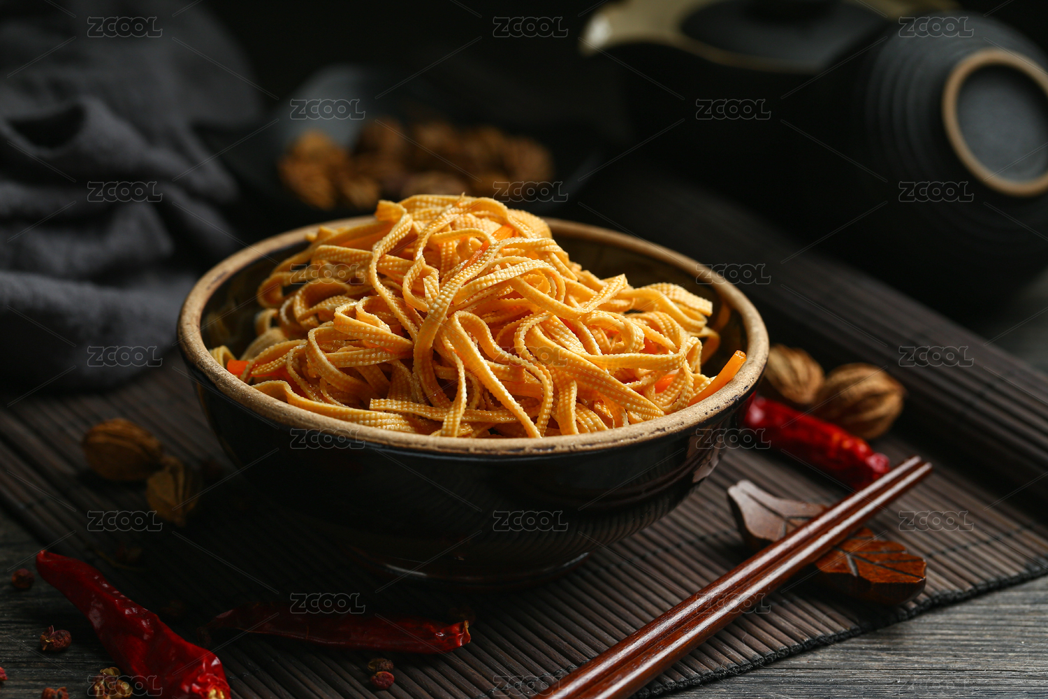 紅油豆皮豆腐絲放在黑色土碗里