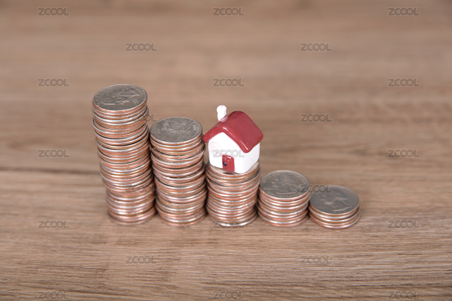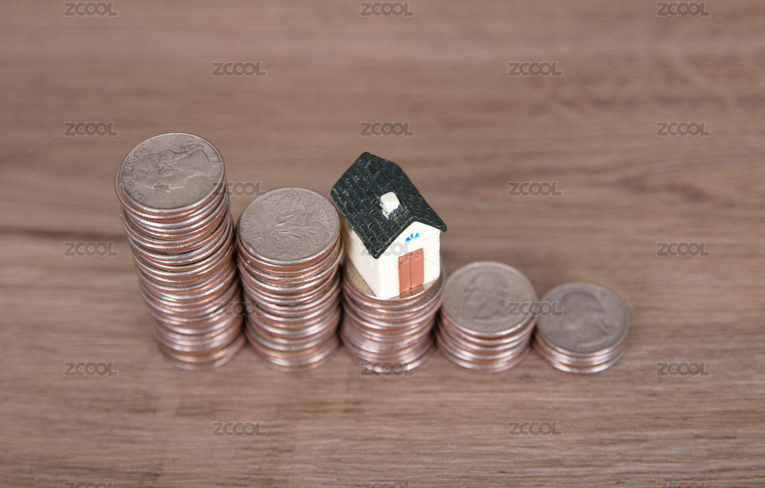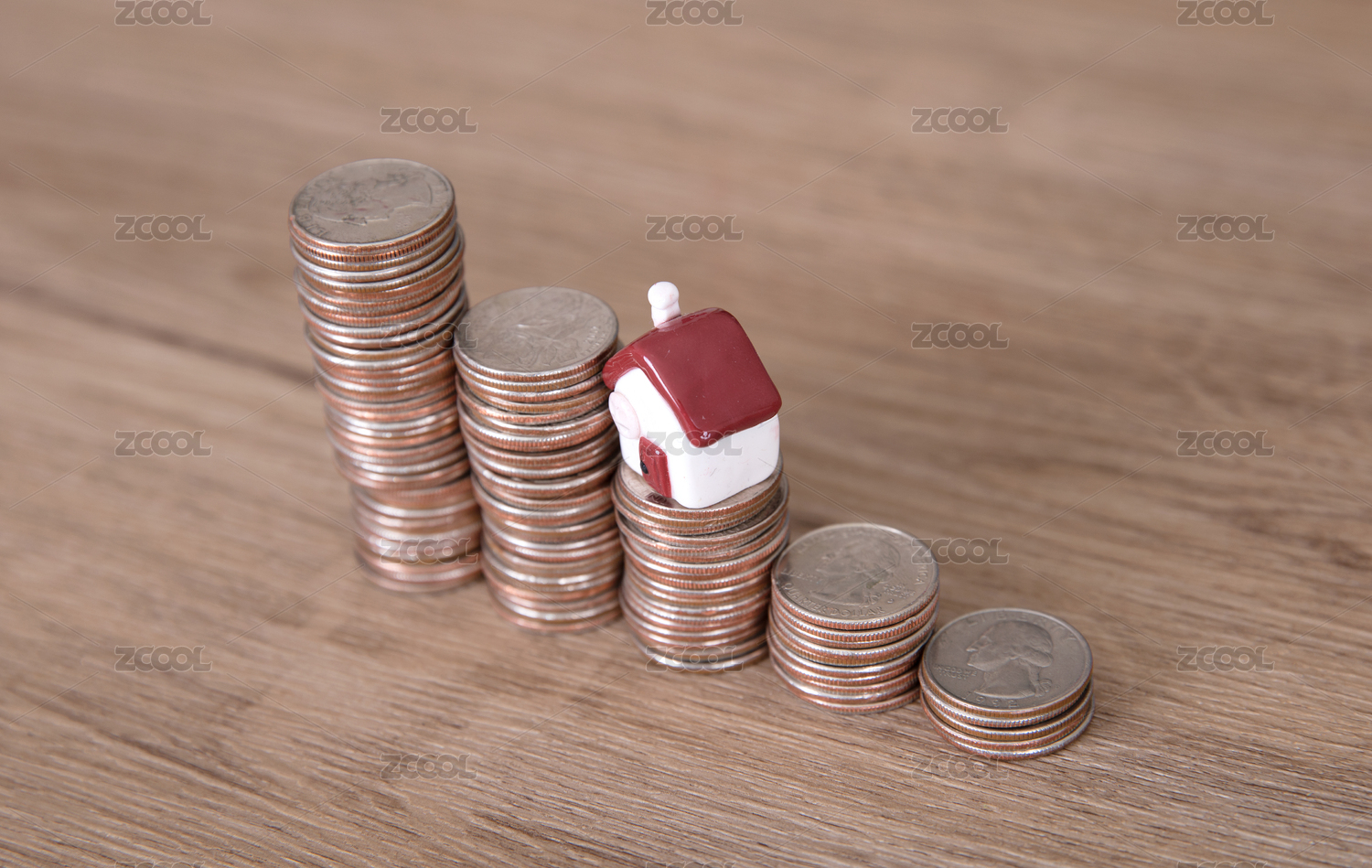 美元硬幣和房子模型模擬房價逐漸走低概念