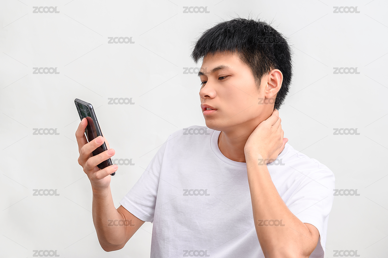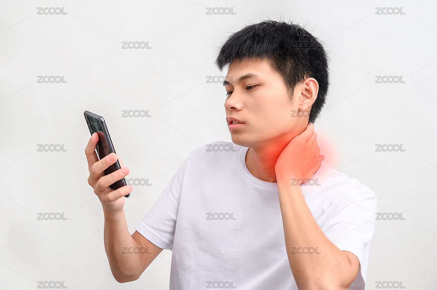 白色背景前邊玩手機邊捂住脖子的人