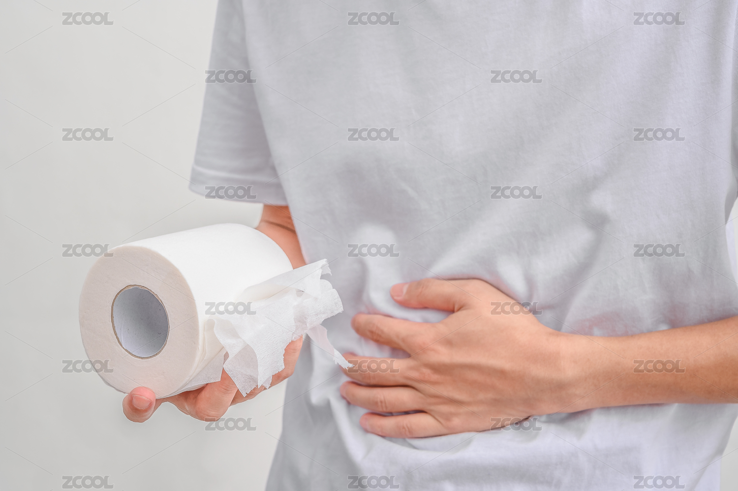 白色背景前一手拿著紙巾一手捂住肚子的人
