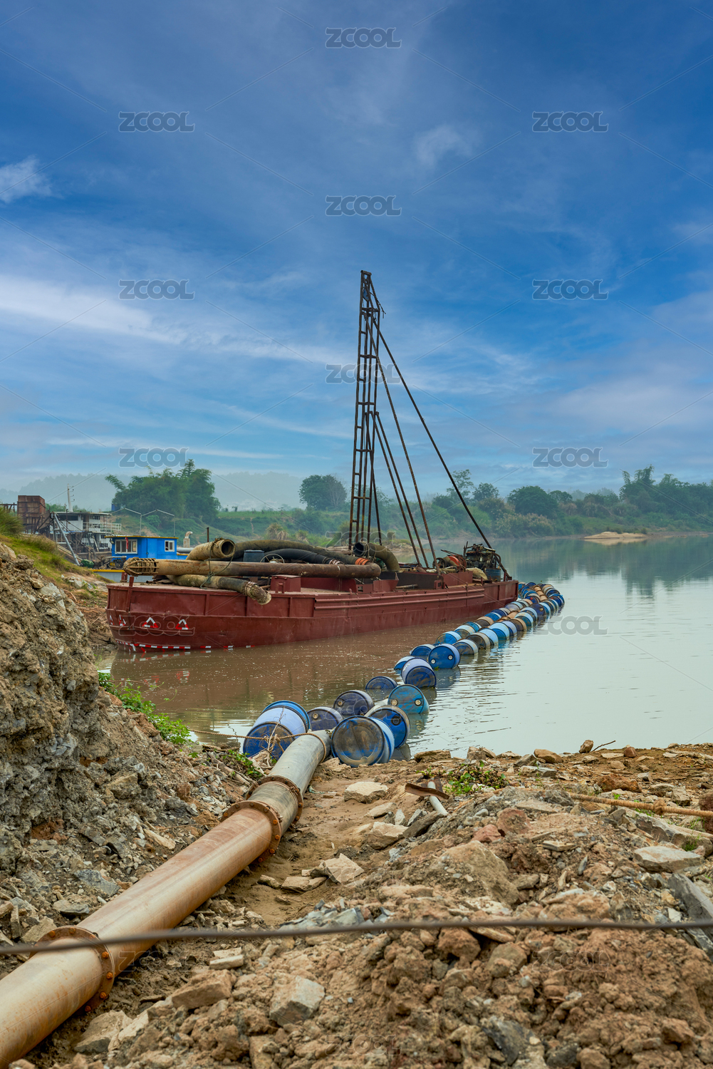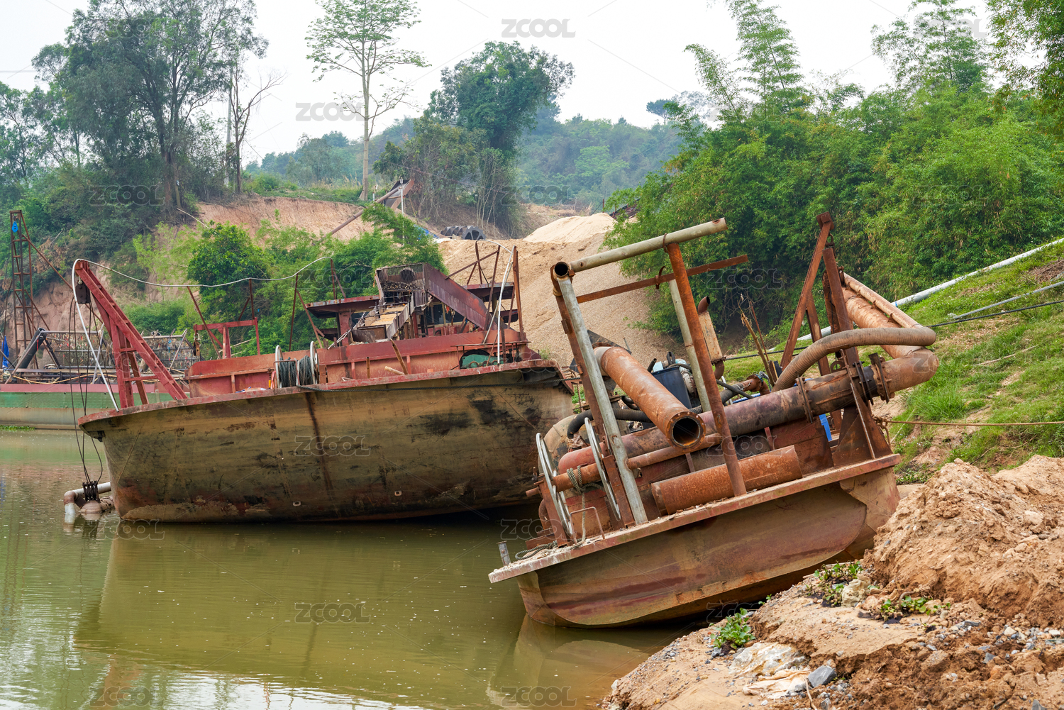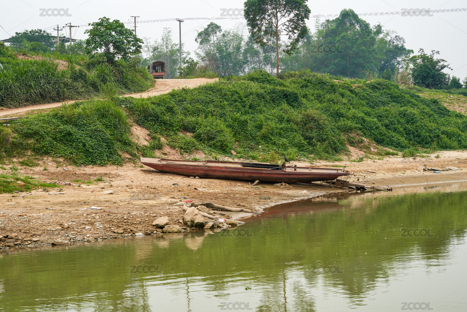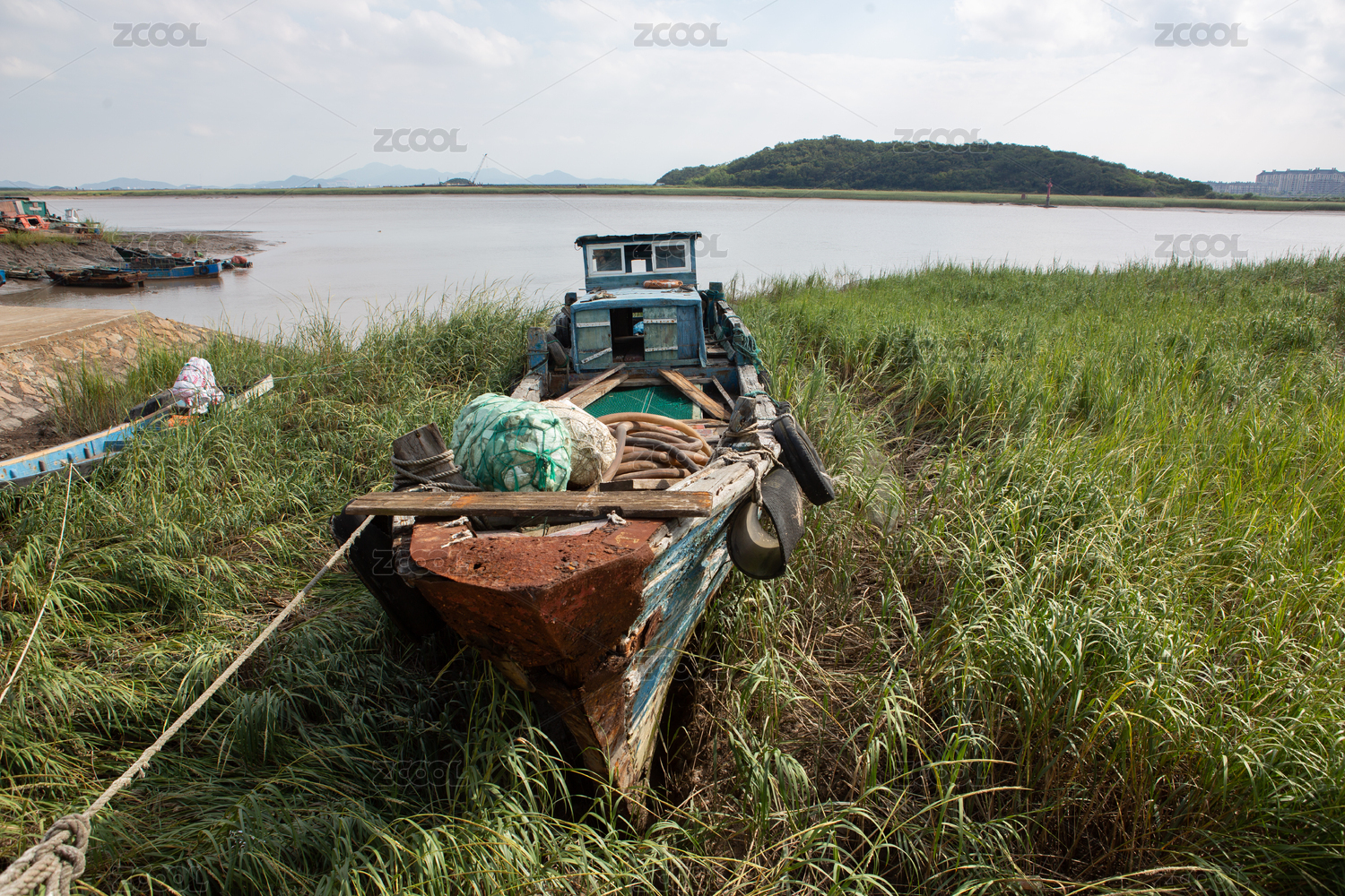 擱淺在河灘上的廢棄漁船工具船