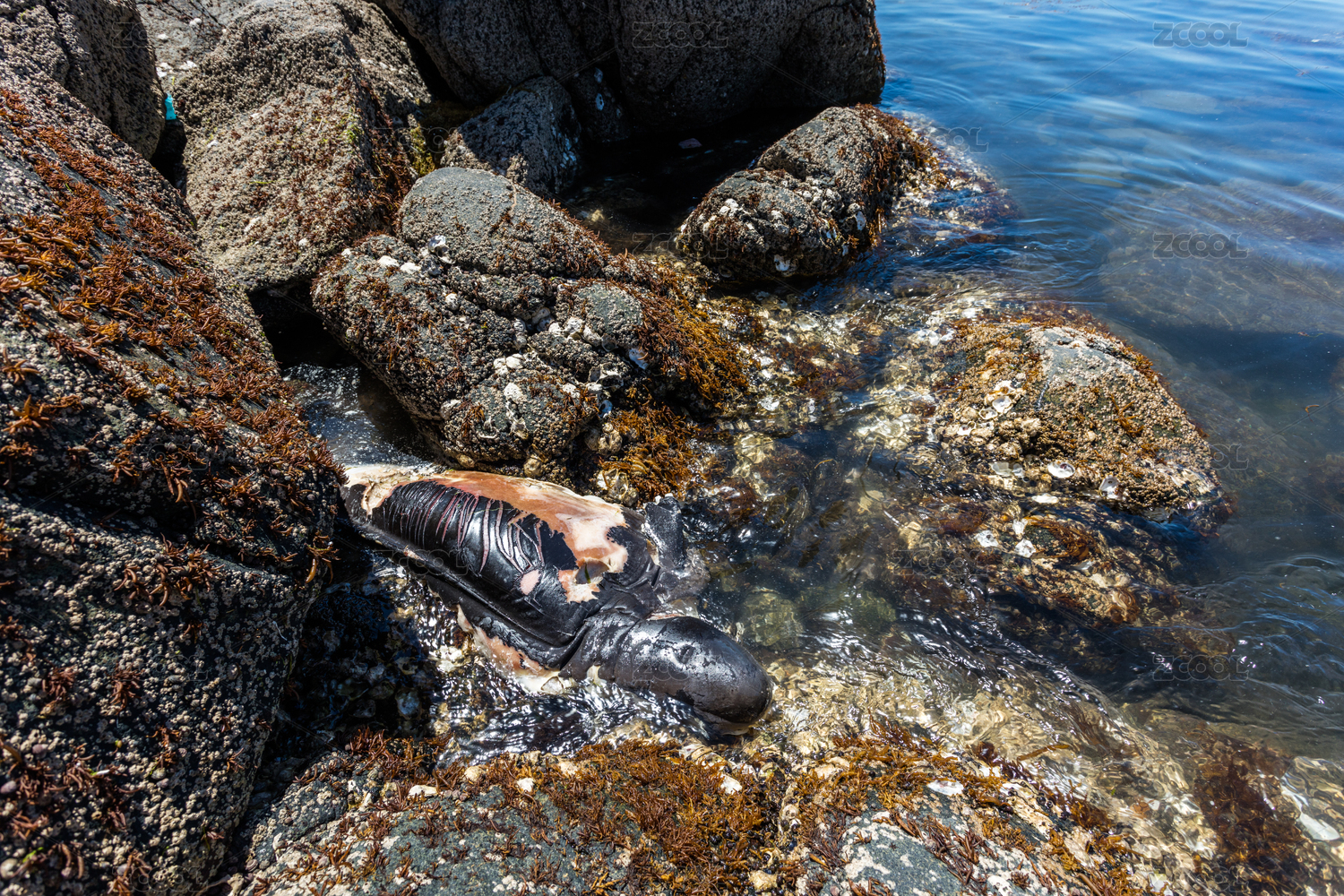 海邊礁石上一條擱淺死亡腐爛的大魚