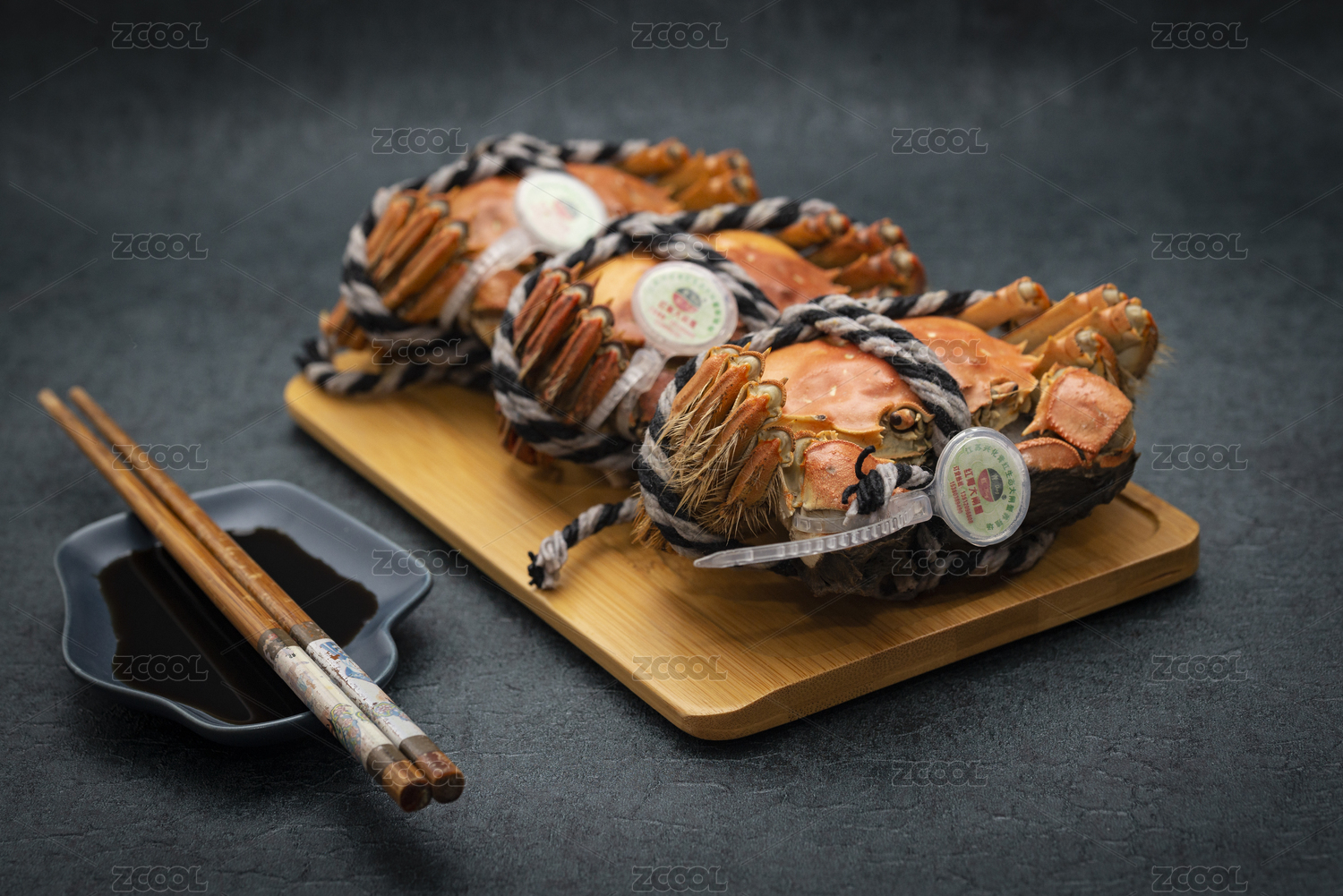 黑背景下精致擺放的三只煮熟的陽澄湖大閘蟹