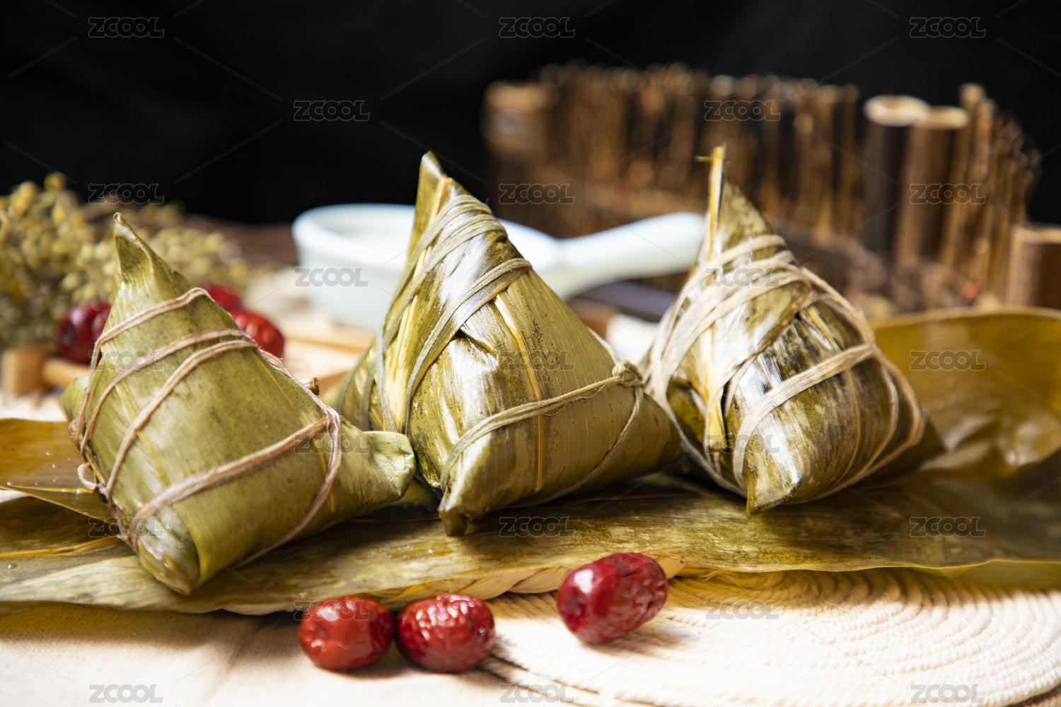 放著木紋背景上的三只尖角粽子,旁邊放著粽子食材