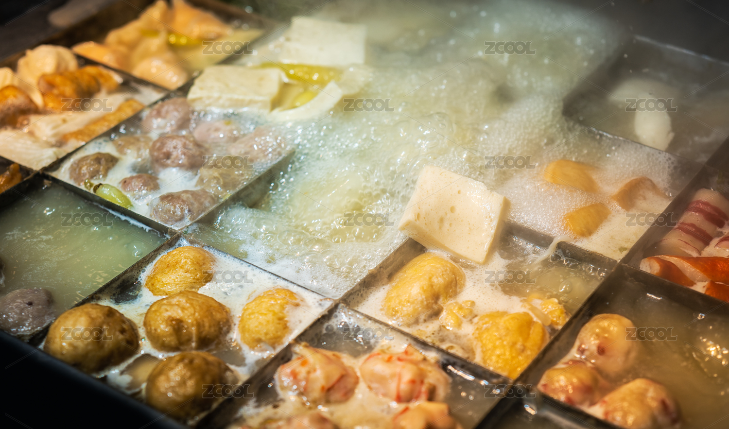 格子鍋里正在烹飪的關(guān)東煮美食特寫