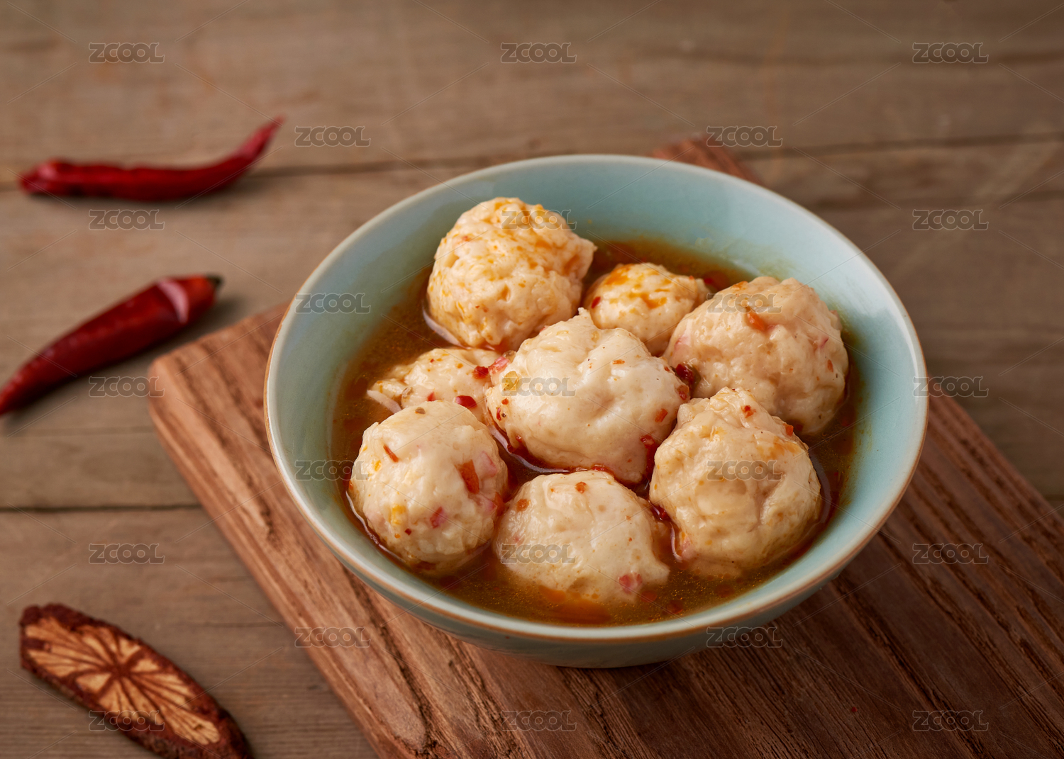 木桌上的麻辣關(guān)東煮丸子