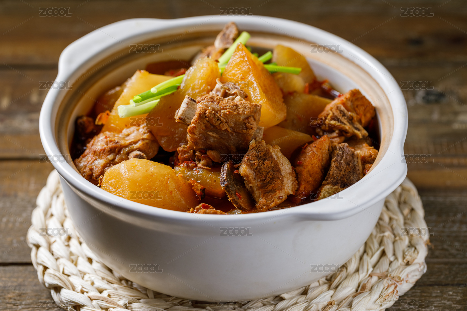 放在木桌上的中國四川排骨燒蘿卜特寫