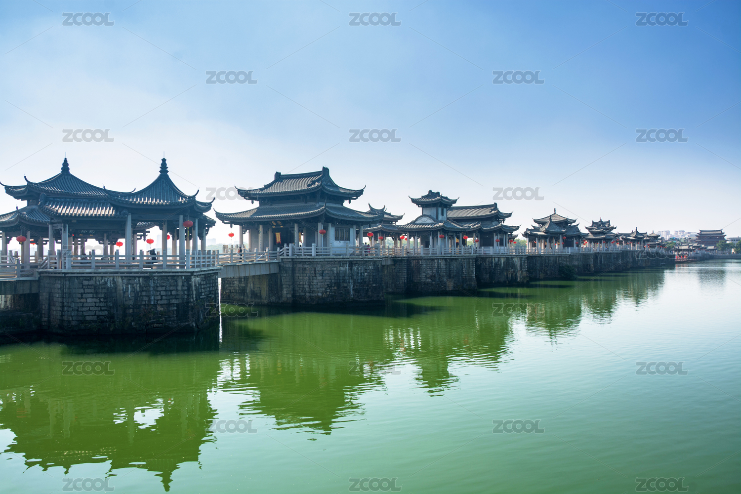 一座橫跨在純凈水面上的古代橋梁