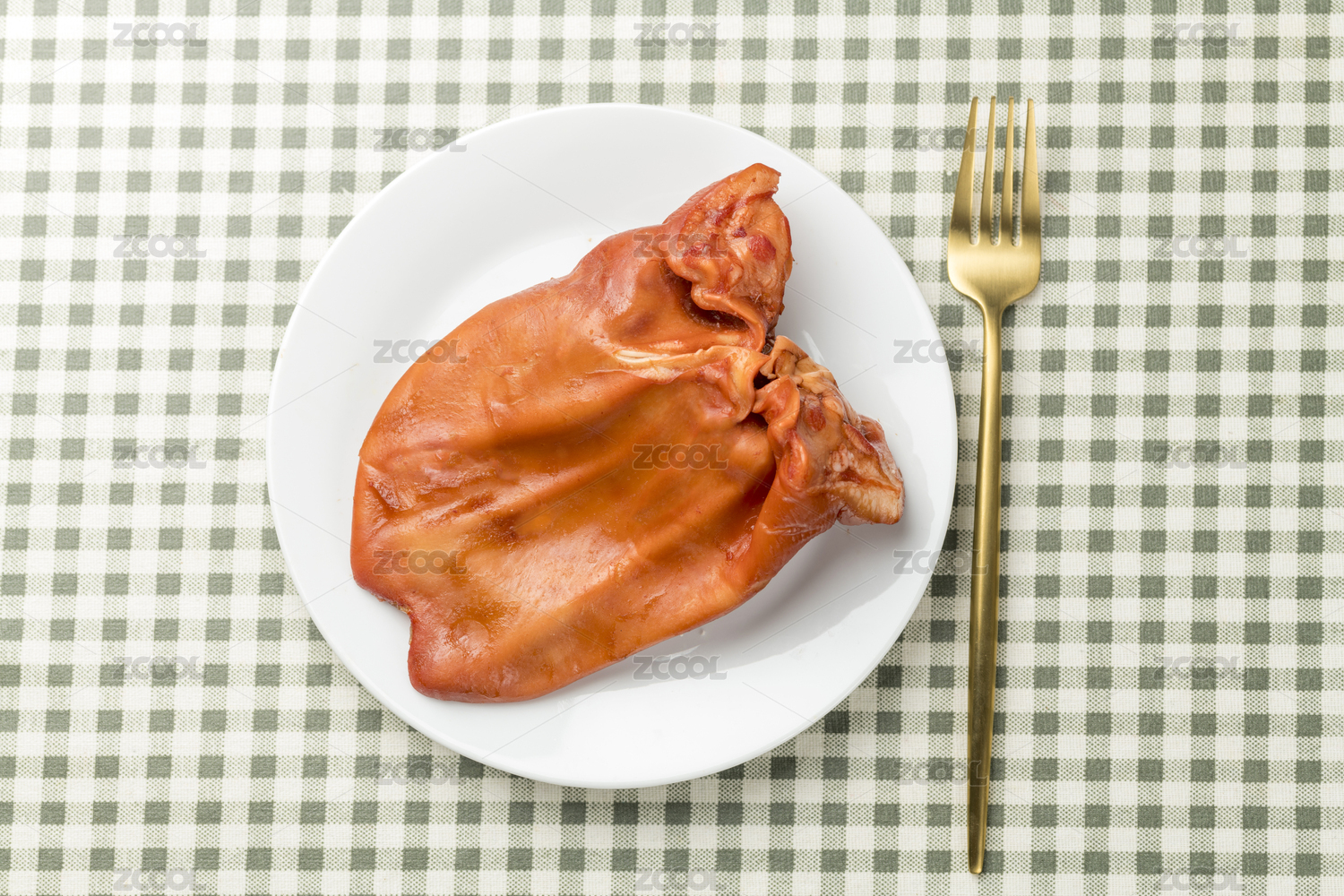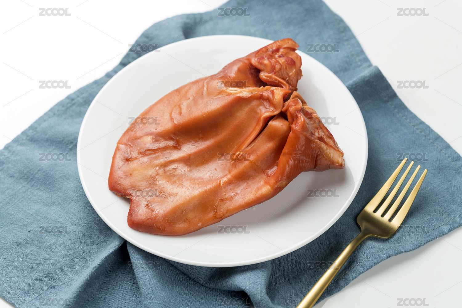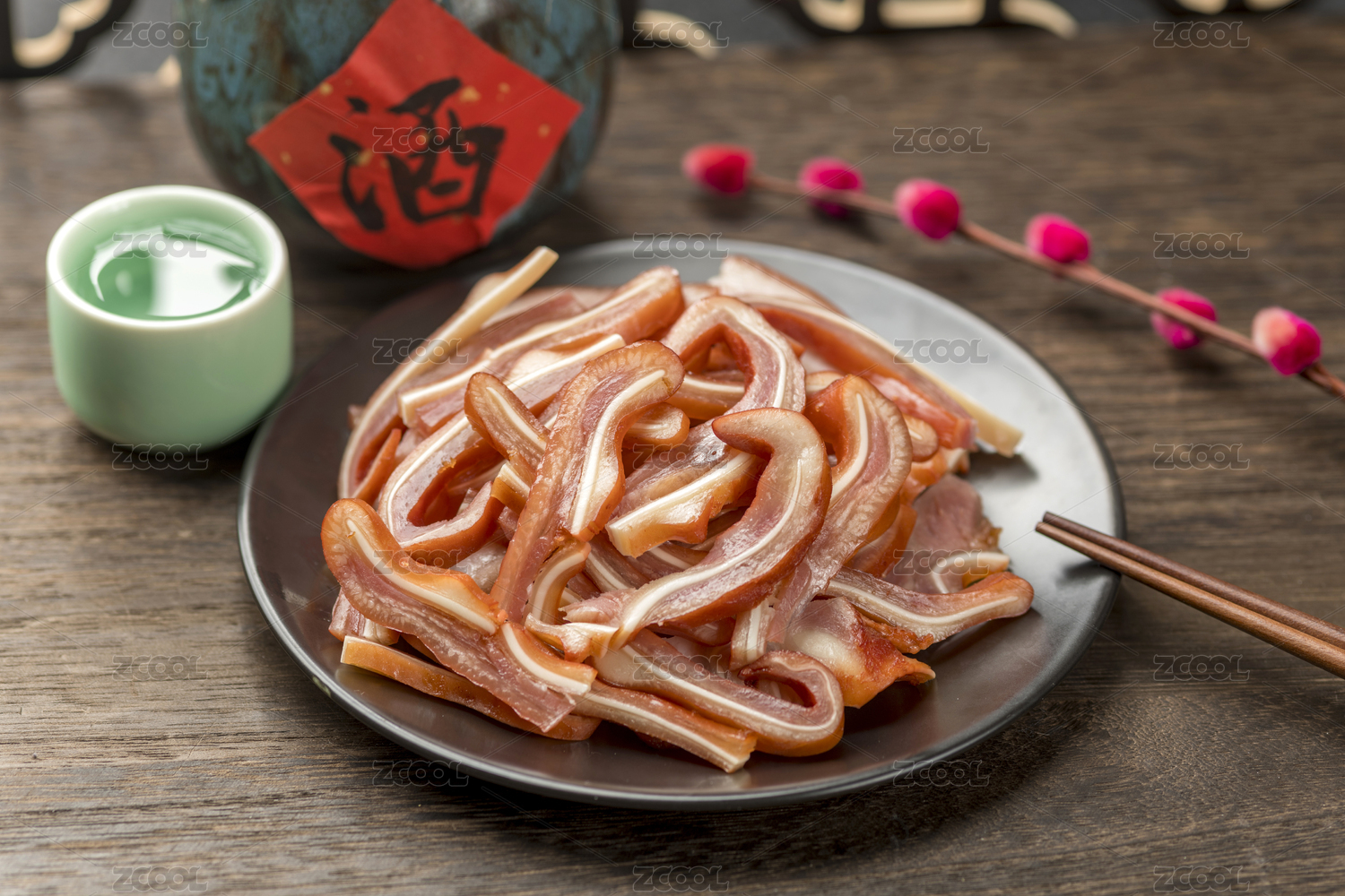 一盤醬豬耳擺放在古窗欞木桌面上特寫
