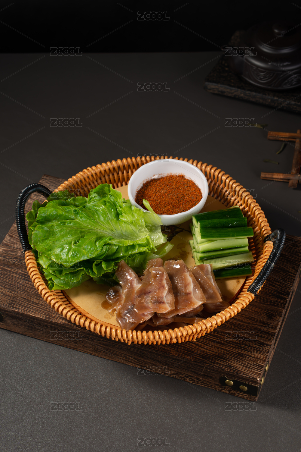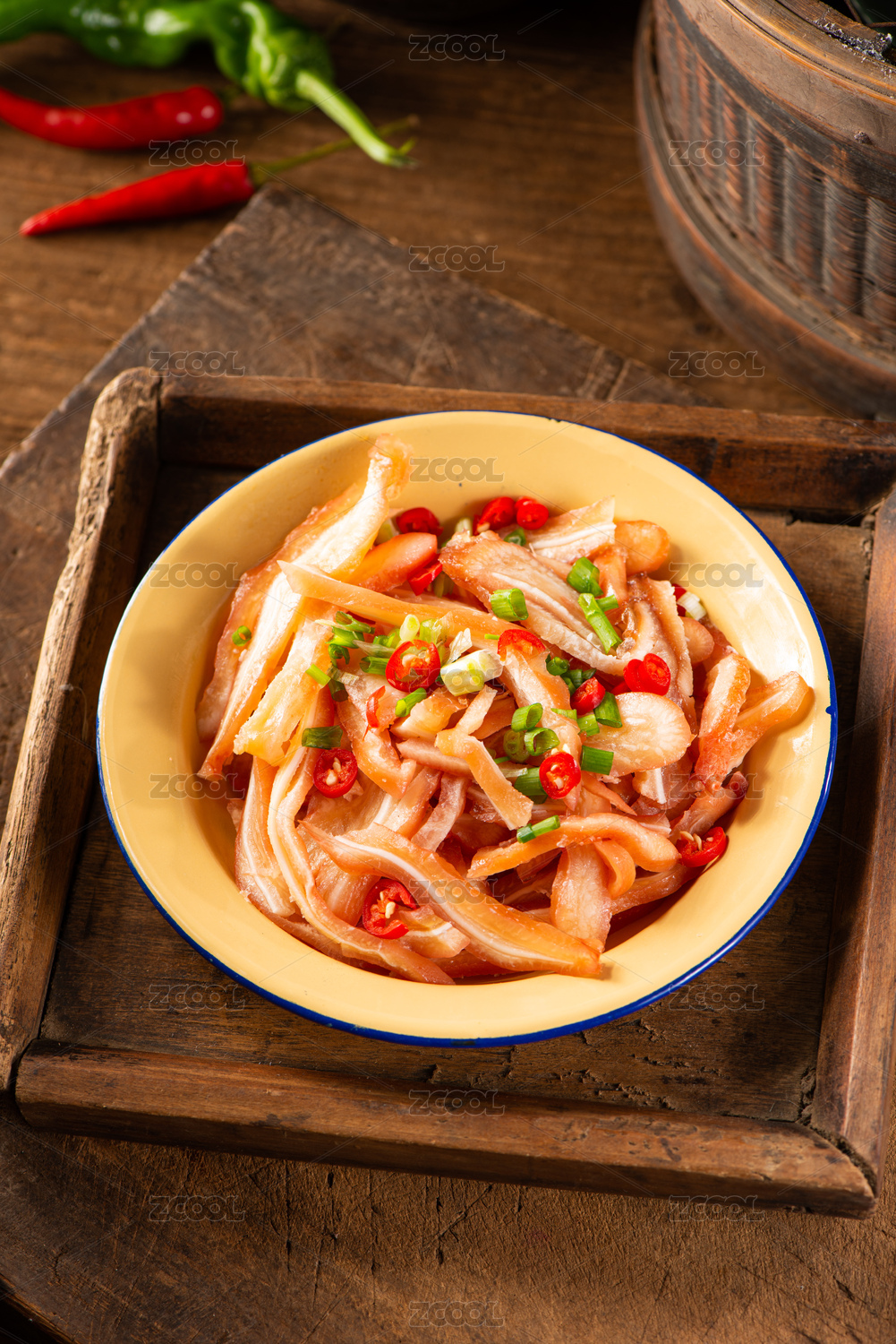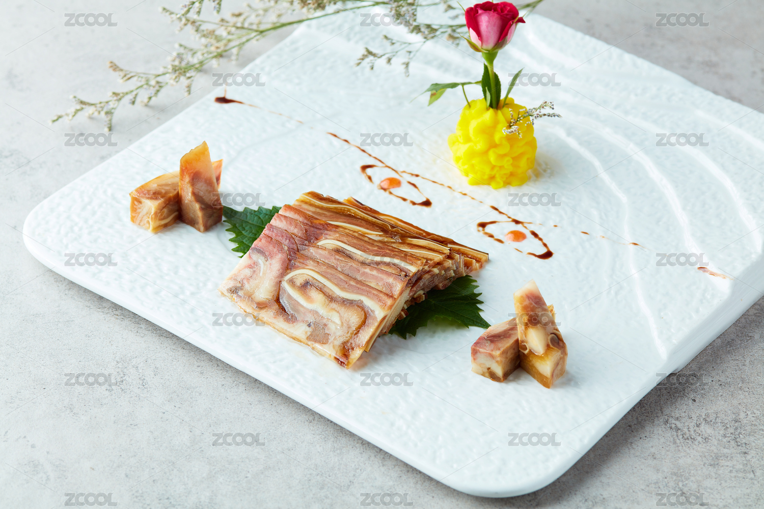 一盤醬豬耳擺放在古窗欞木桌面上特寫