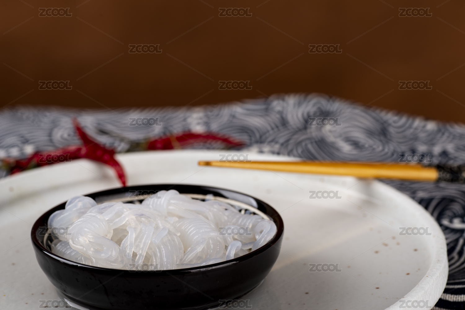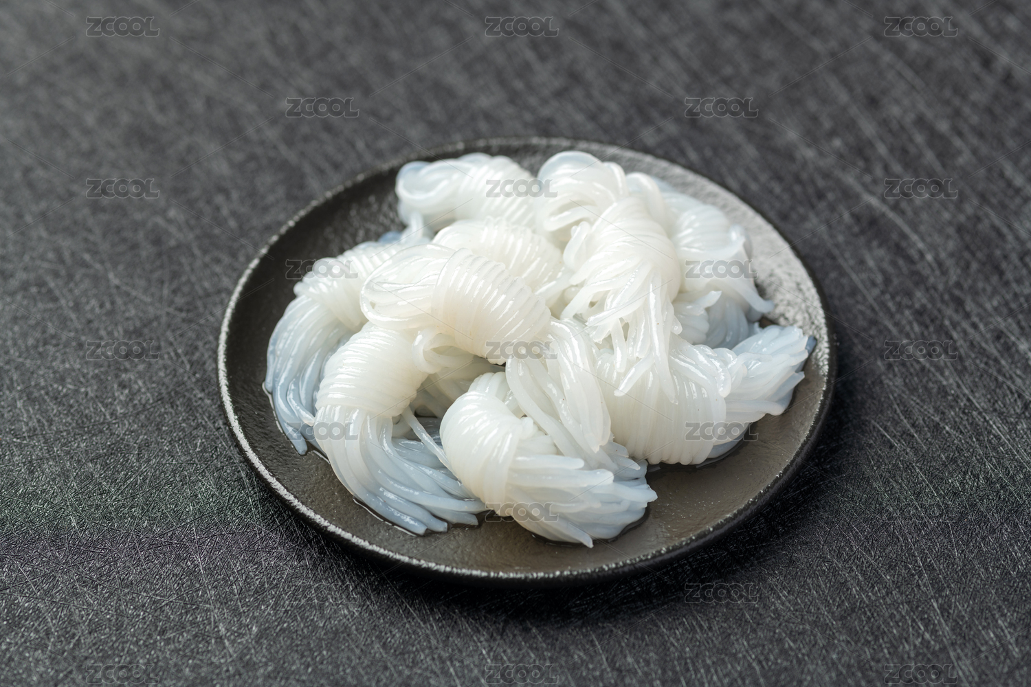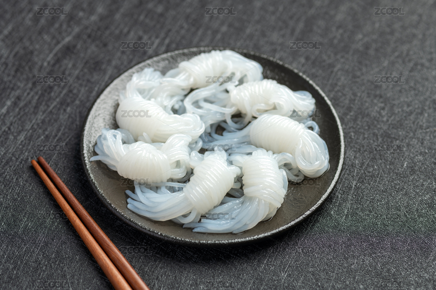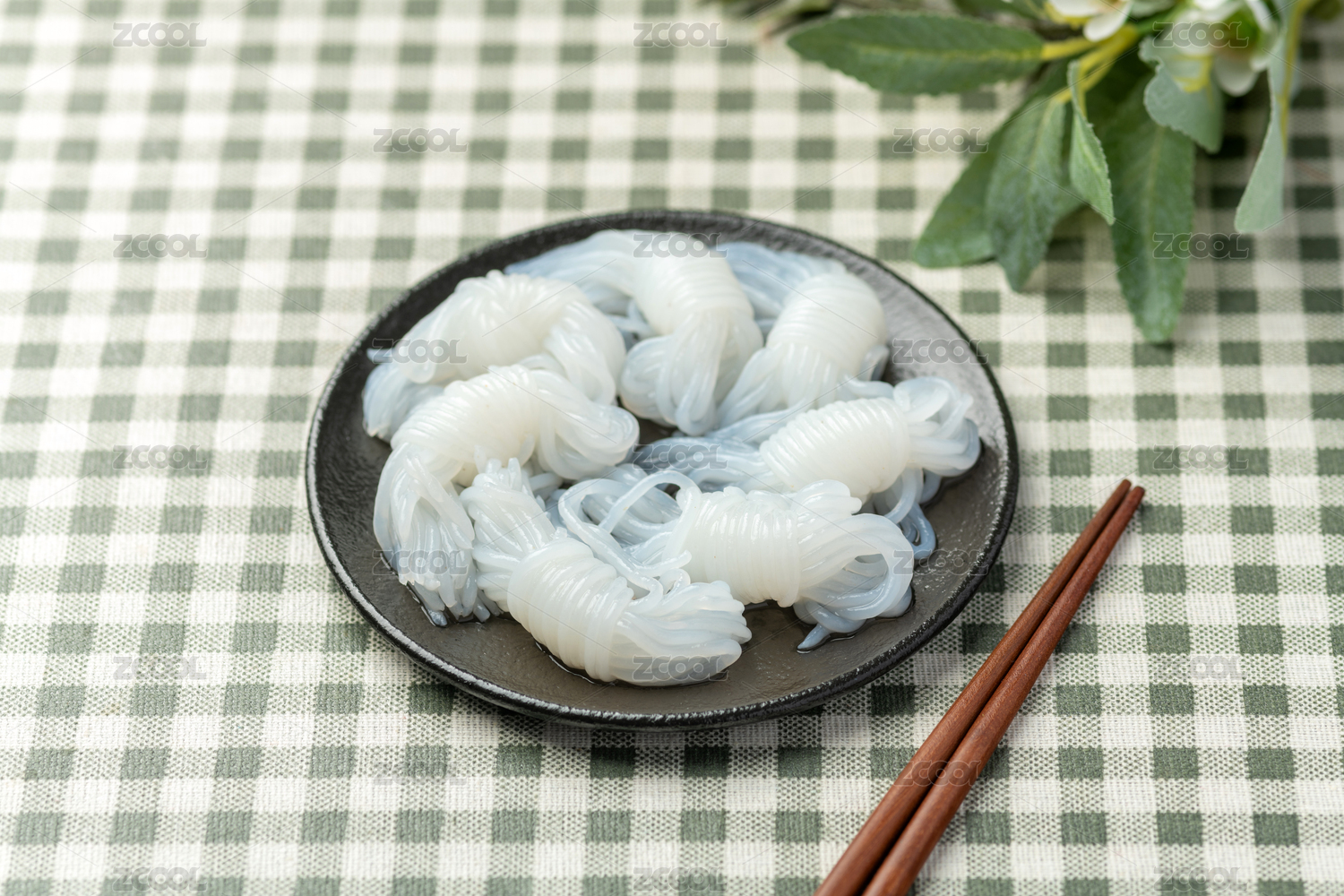 桌面上的盤子里的美味可口的干魔芋絲結(jié)