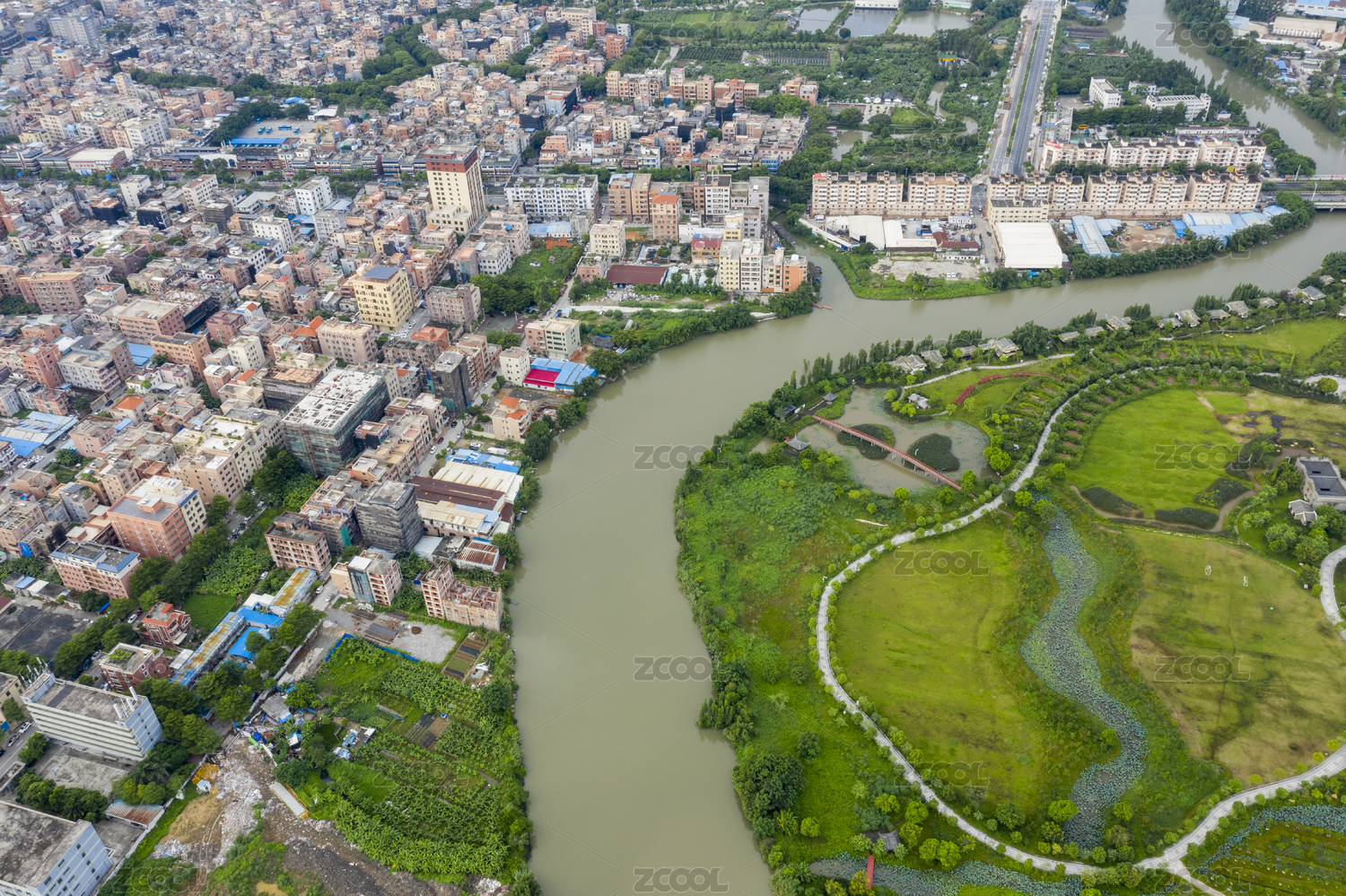 航拍濕地公園園周邊的建筑和彎曲的河流