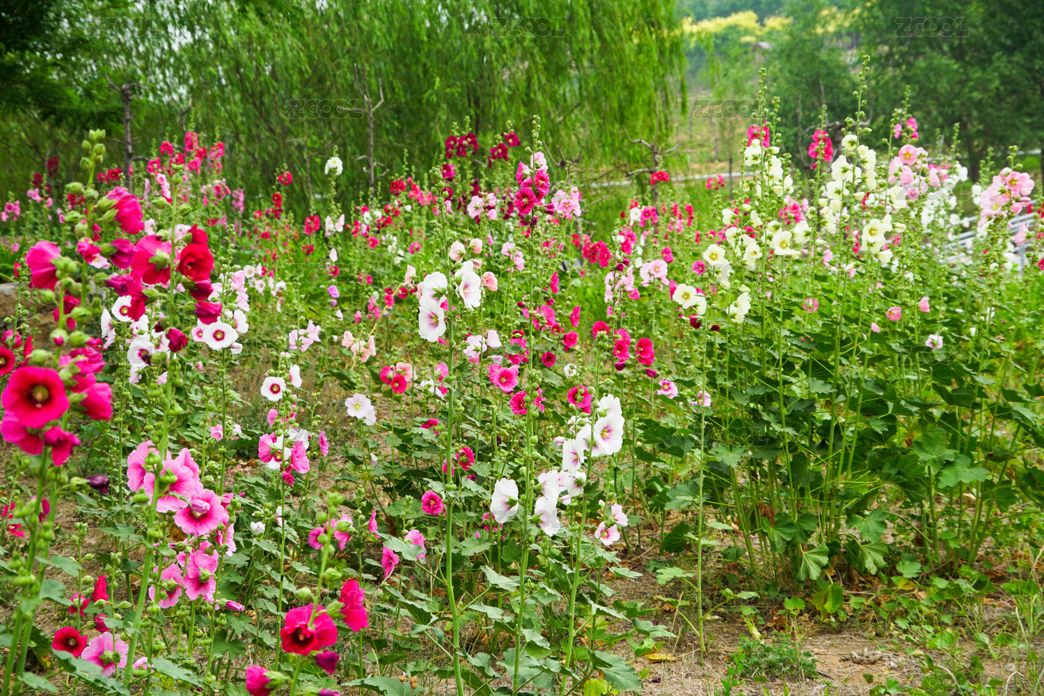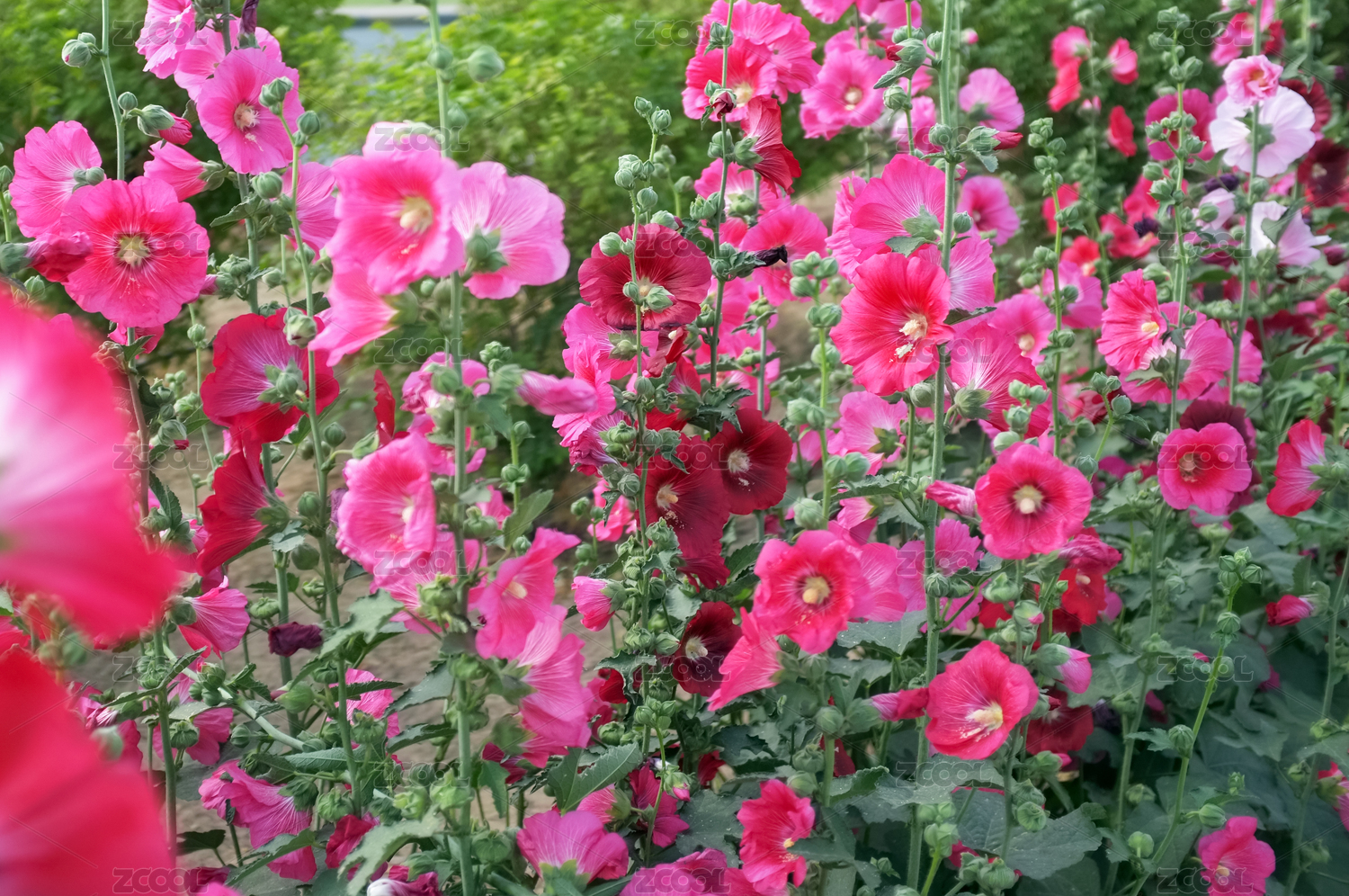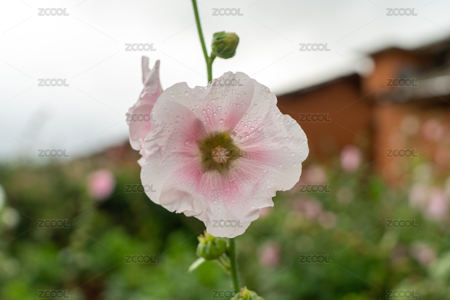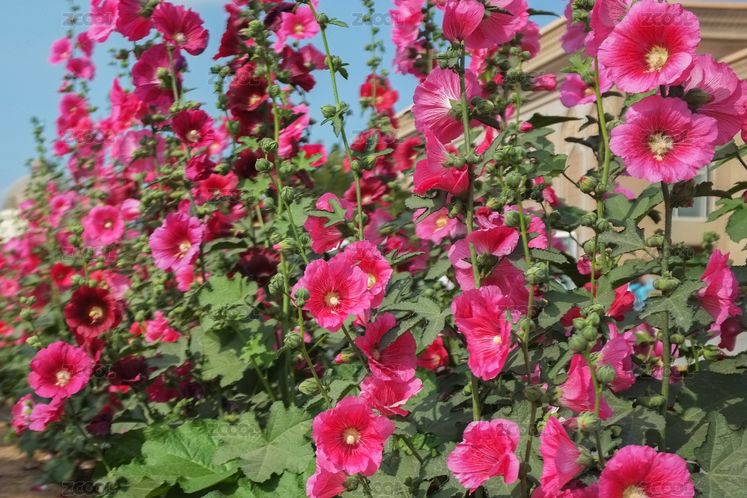 中國藏族房屋前種植的粉色和白色的蜀葵花