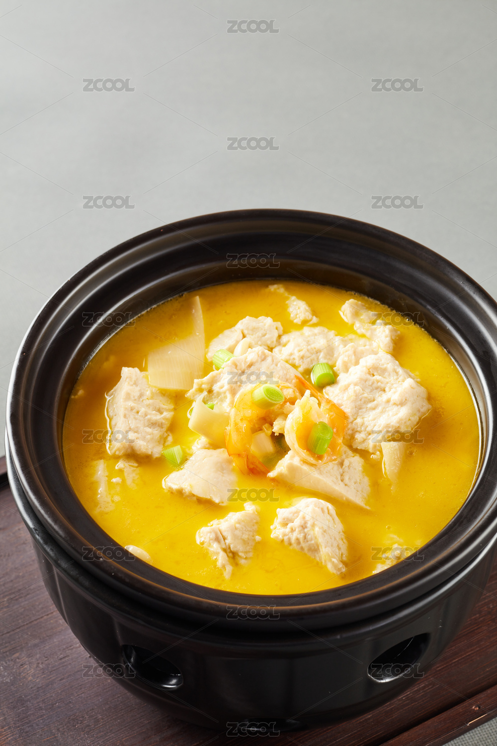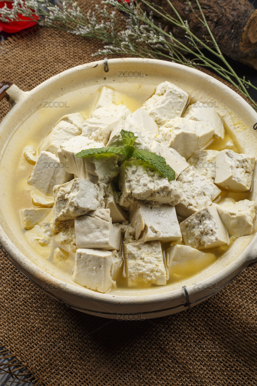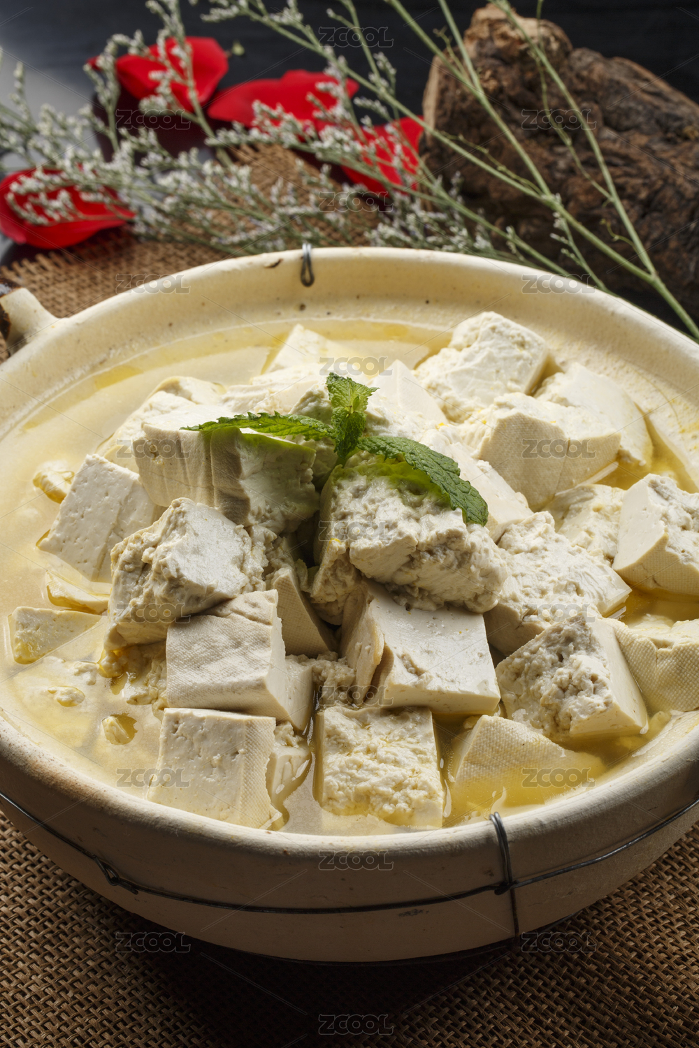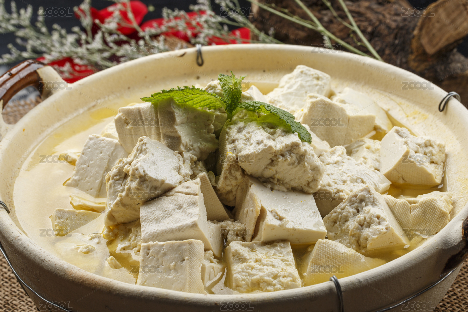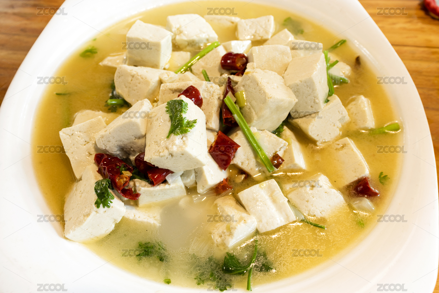木桌上一大盤(pán)雞湯燉豆腐的特寫(xiě)