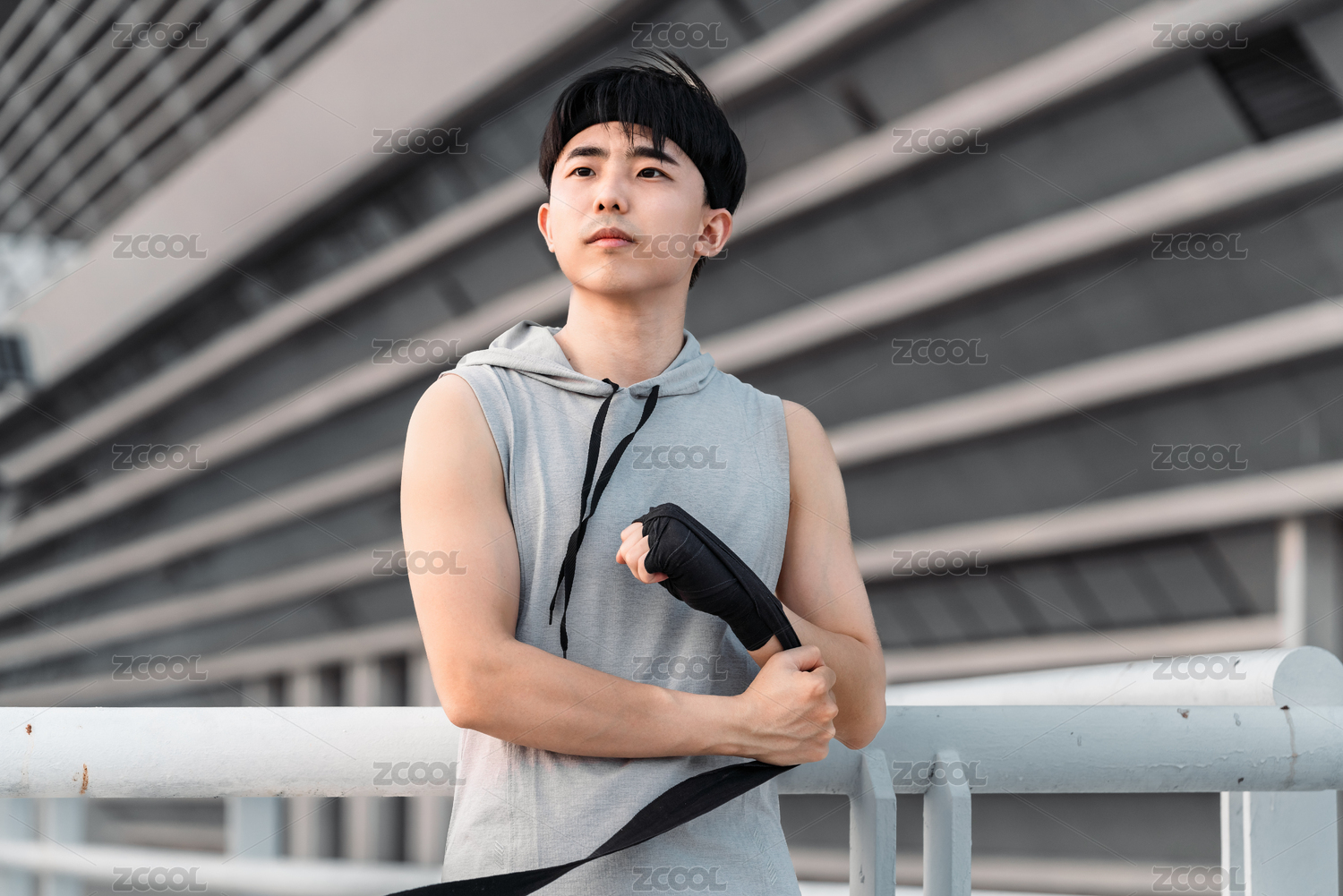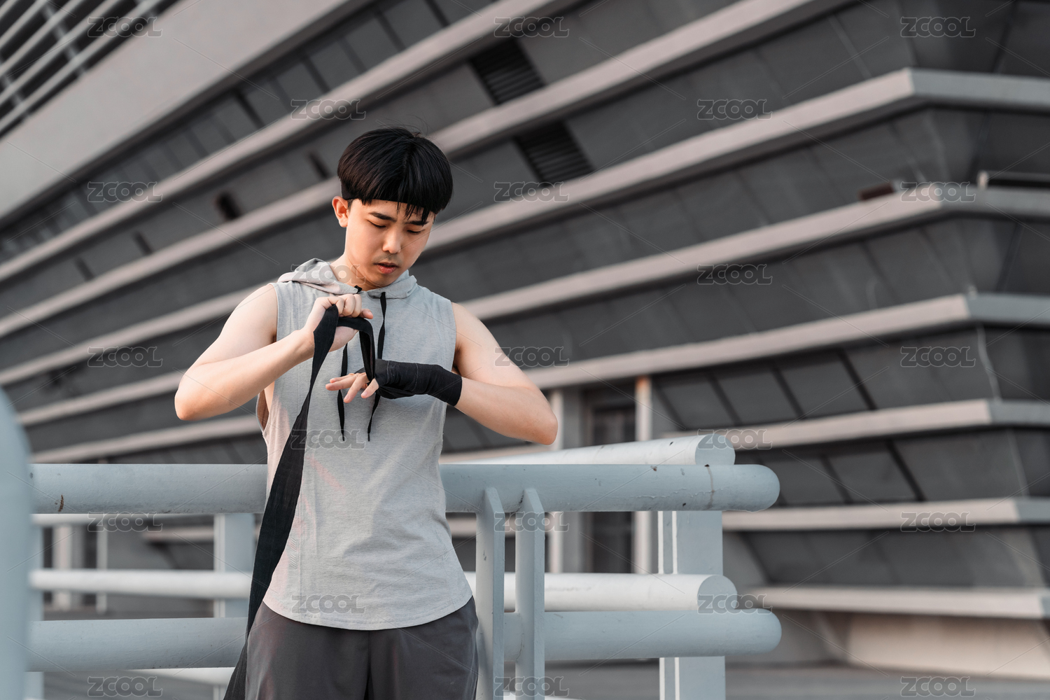 亞洲男生在戶外纏拳擊繃帶