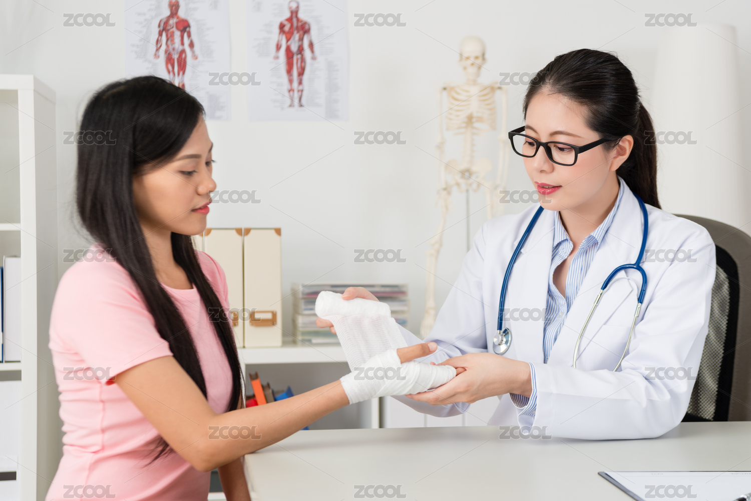 用繃帶幫助病人手腕纏繞部分疼痛專業(yè)美容女醫(yī)生。