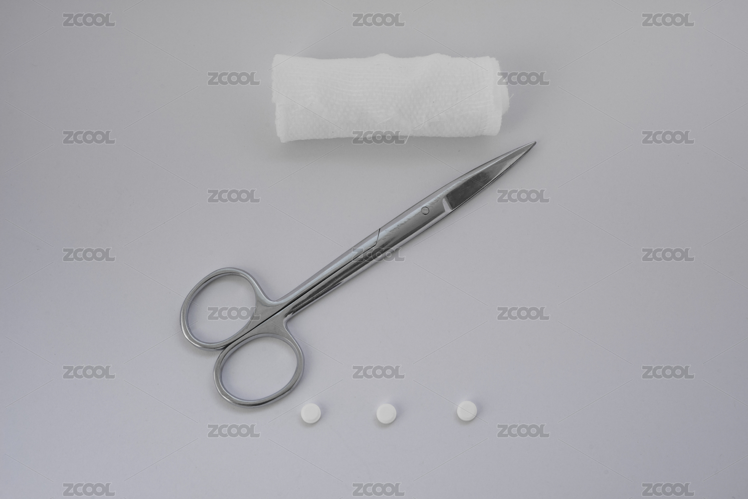 手術(shù)剪刀與白色繃帶和藥片