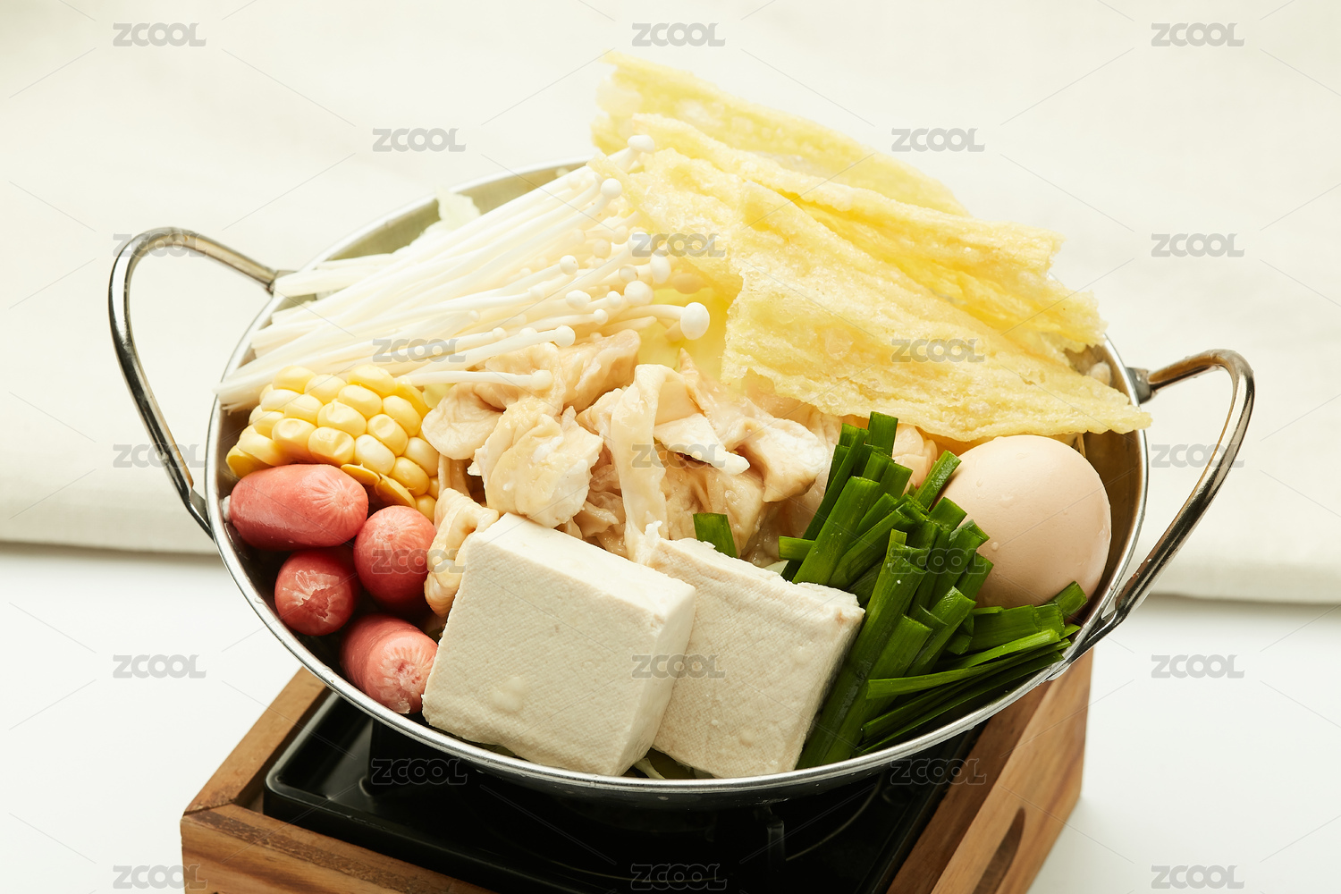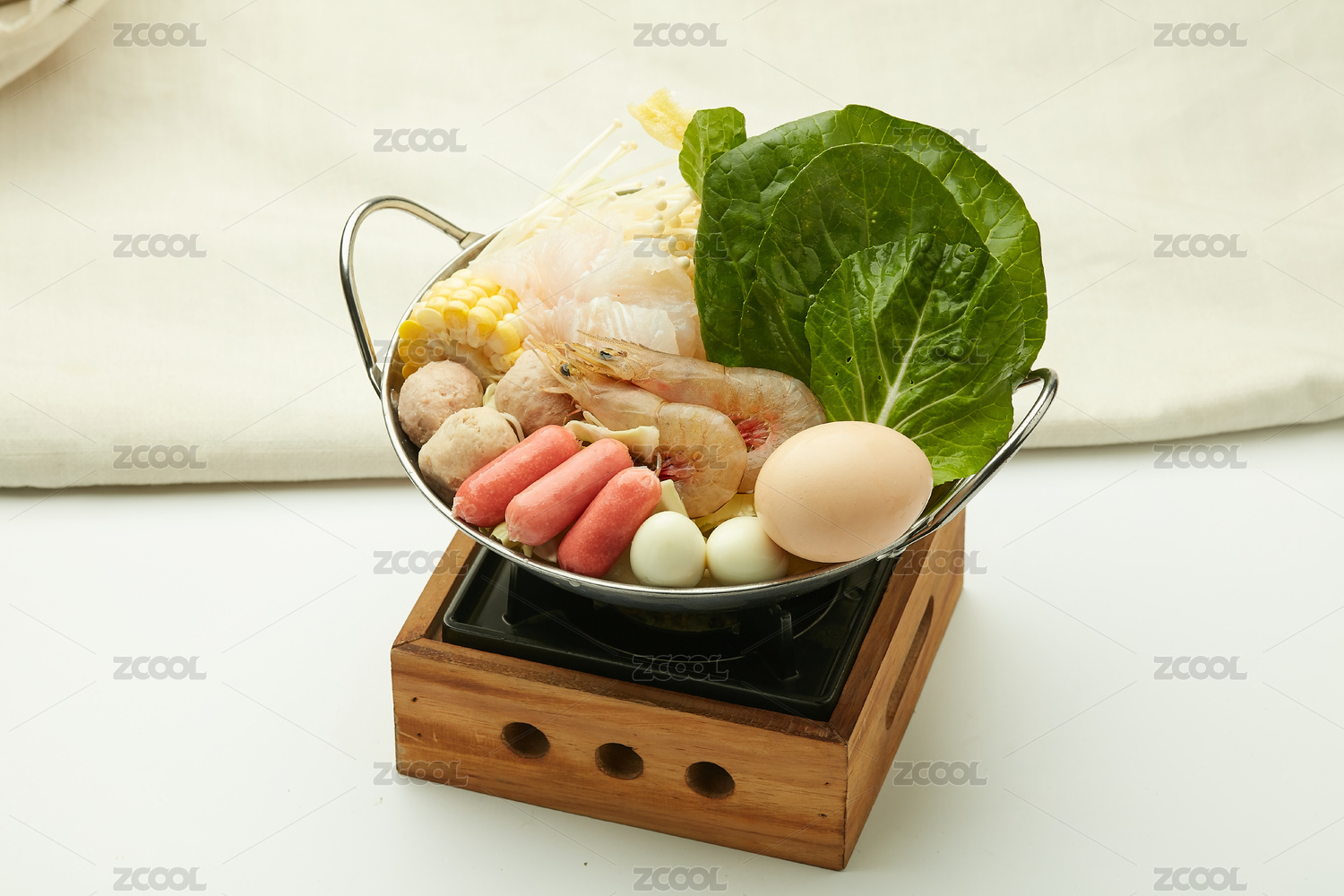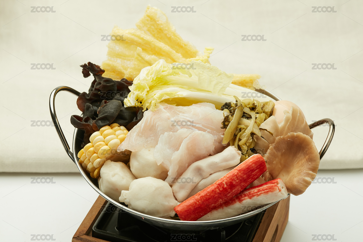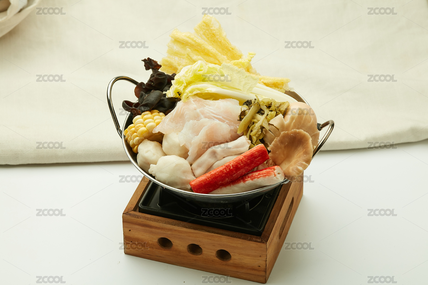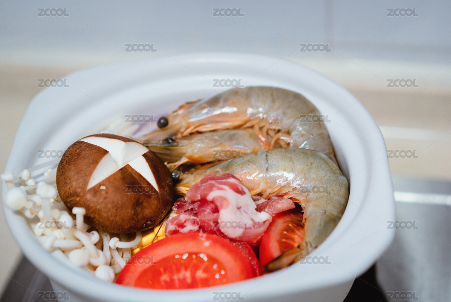 日式海鮮壽喜鍋食材放在白色陶瓷鍋內(nèi)