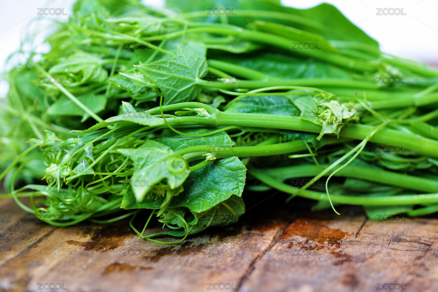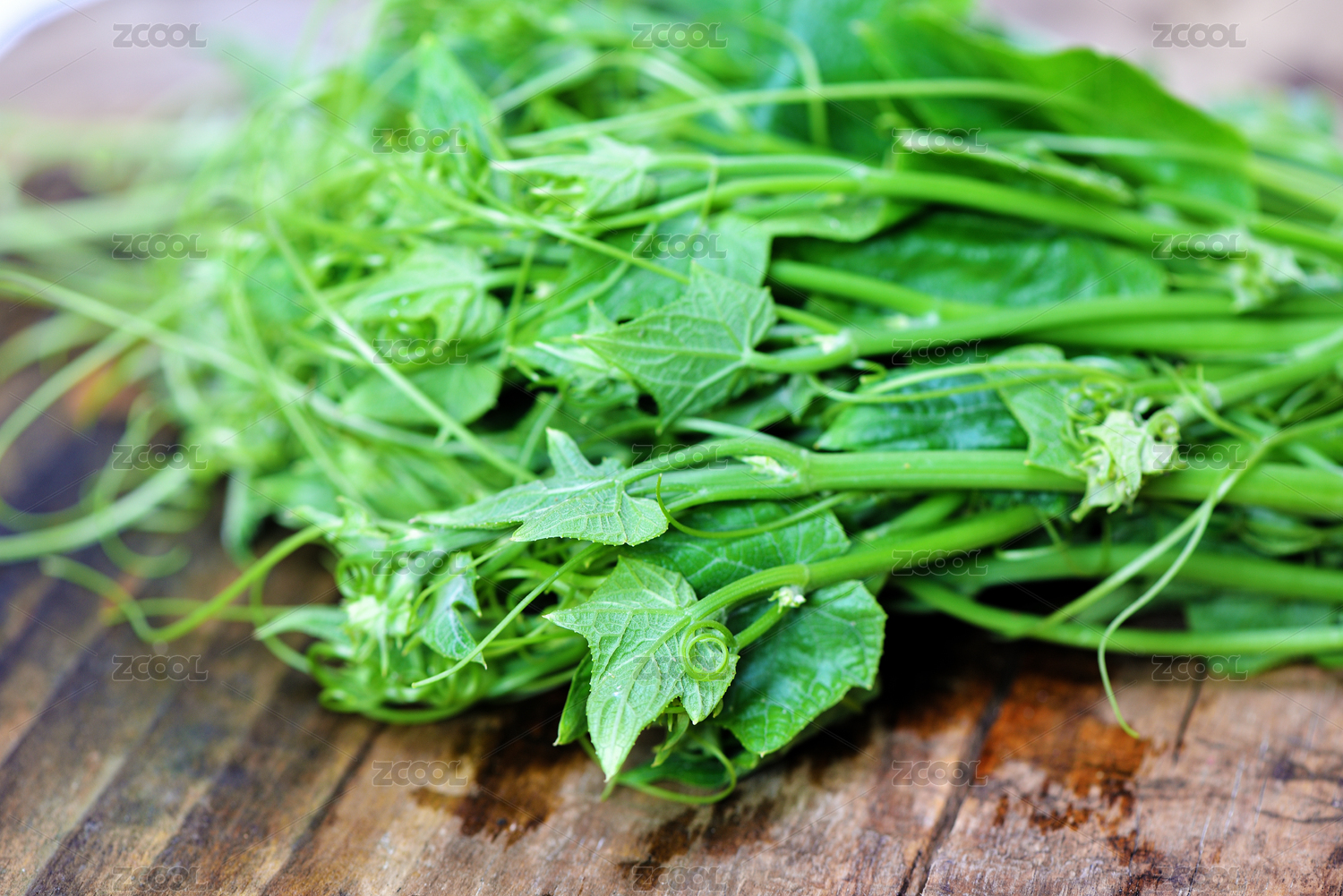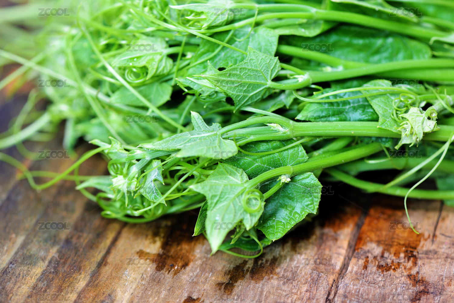 一把新鮮綠油油的佛手瓜苗擺放在木板上面