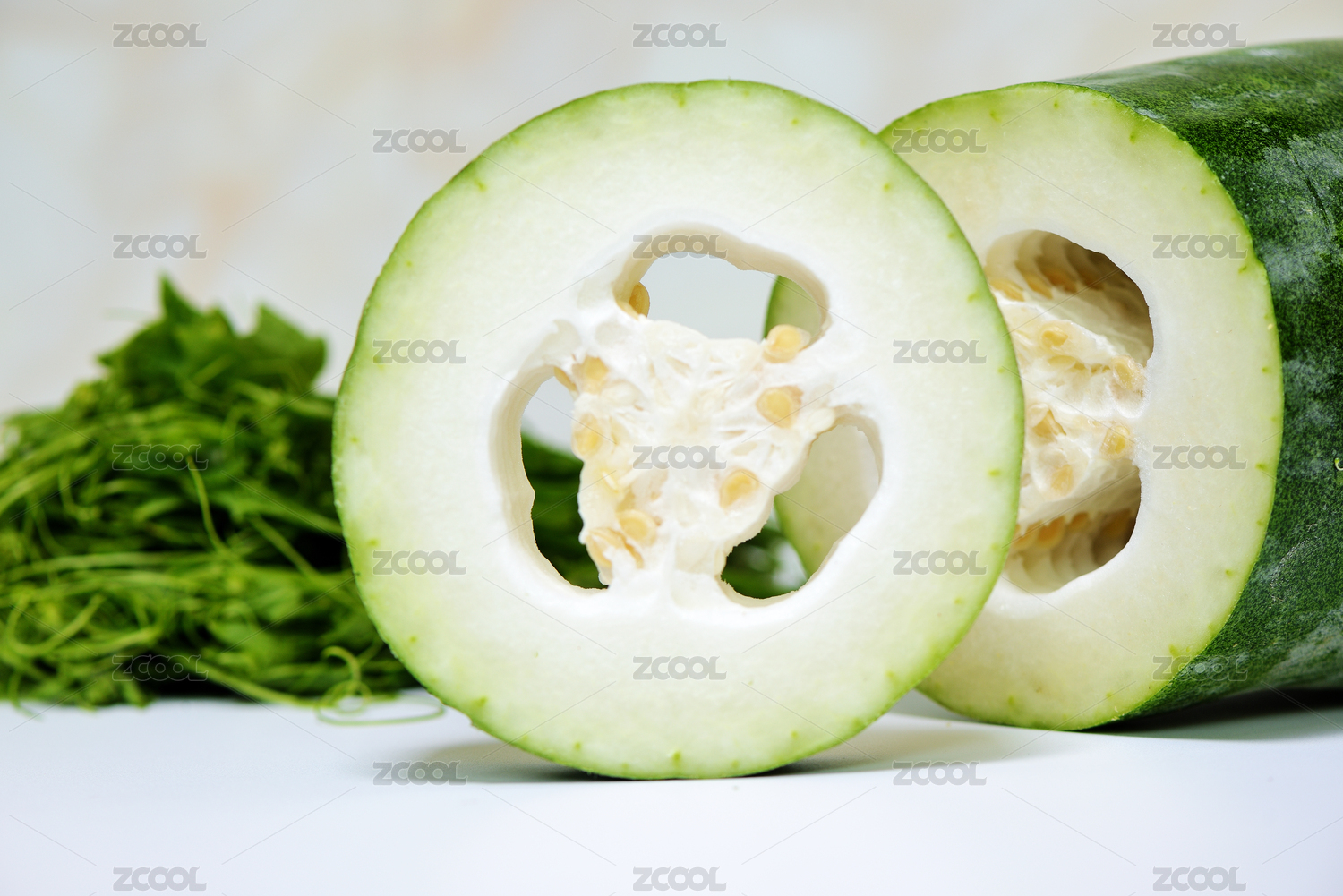 白色臺面上放著一塊切開新鮮的冬瓜和一把瓜苗菜