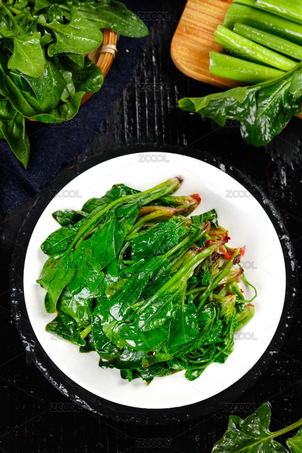黑底上放著一盤清炒菠菜