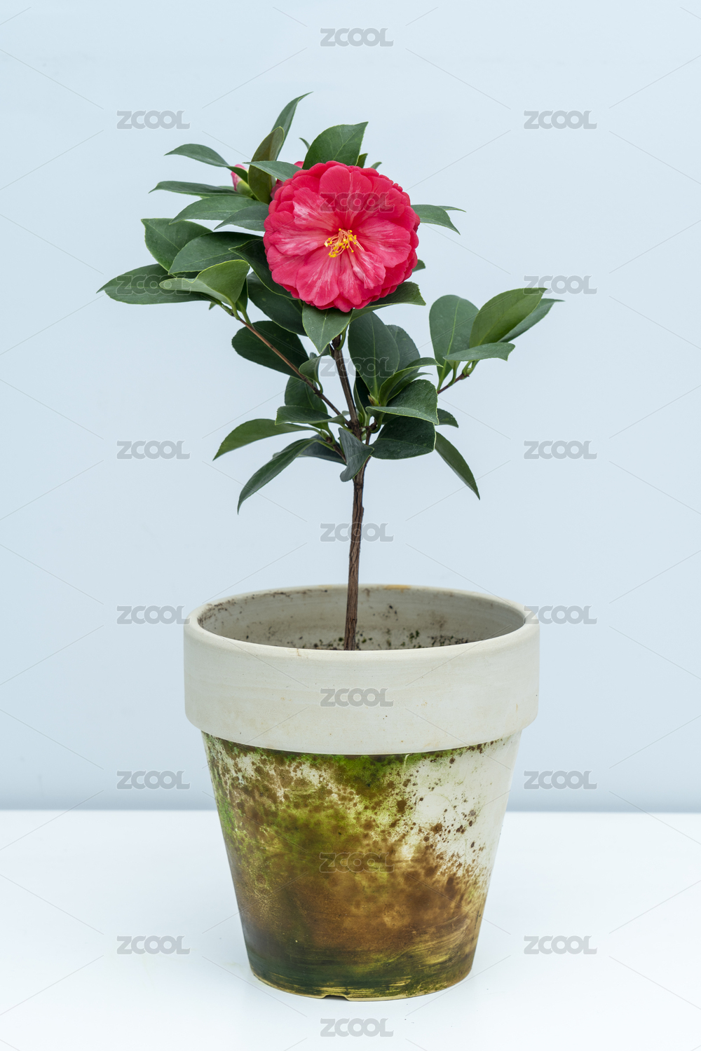 一盆粉紅色的茶花放在白色桌面上
