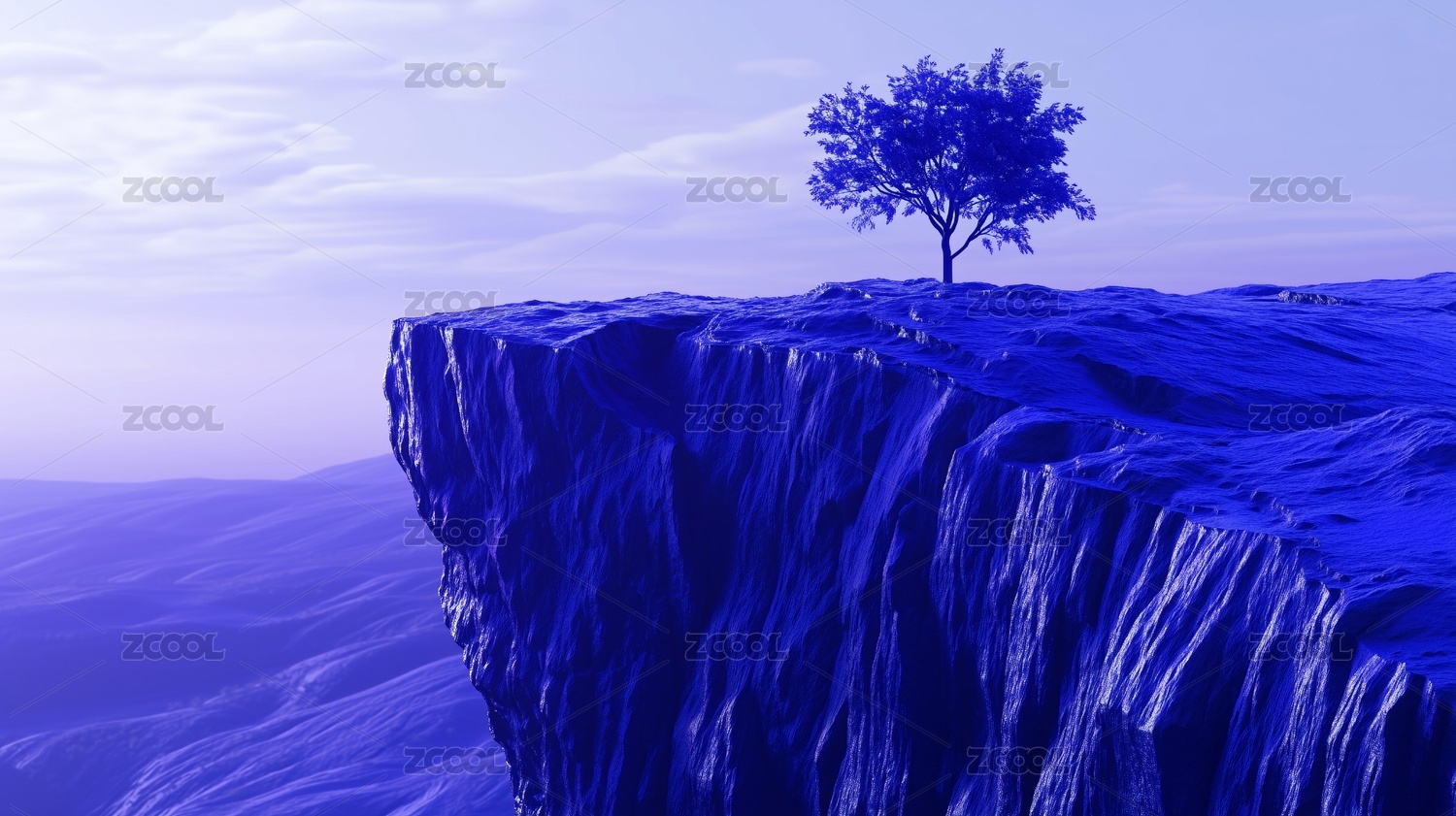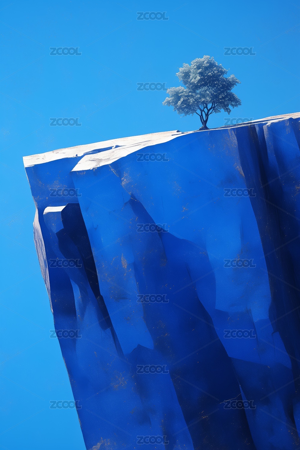 夢幻藍(lán)色調(diào)高聳山崖邊的一棵樹3D立體插畫