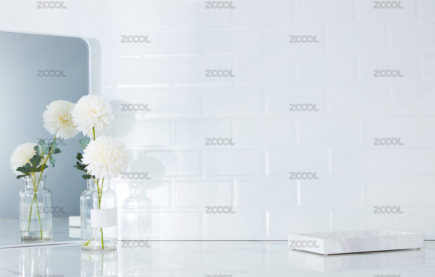 插有乒乓菊的花瓶和托盤在大理石臺面上