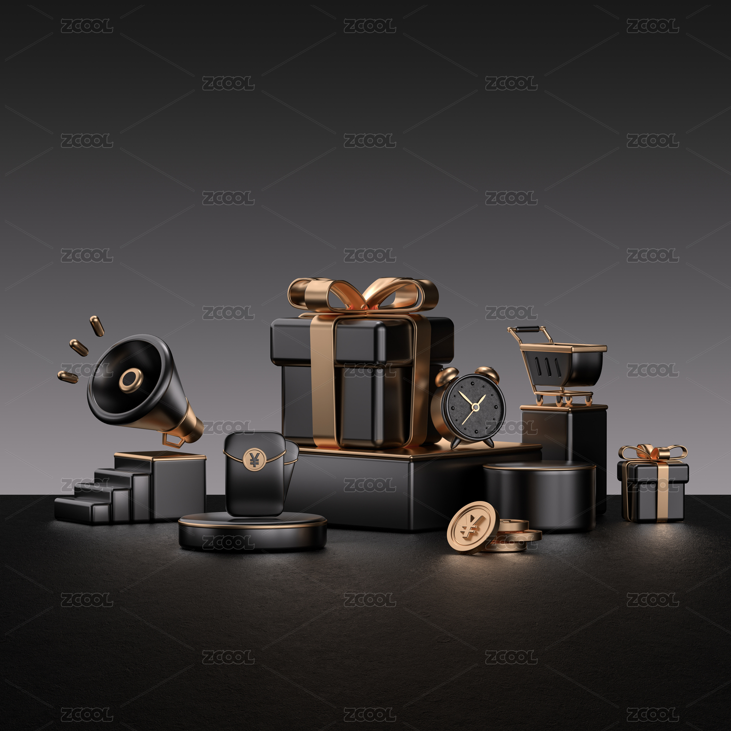 高級灰黑金禮盒元素堆品牌促銷活動3D場景
