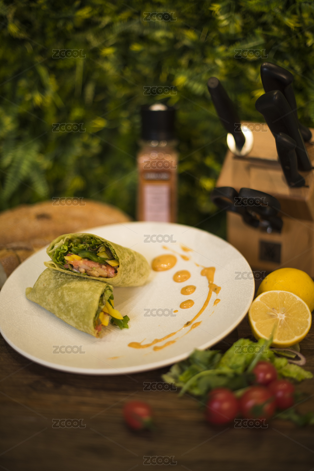 深色背景上的全麥?zhǔn)卟穗u肉卷煎餅