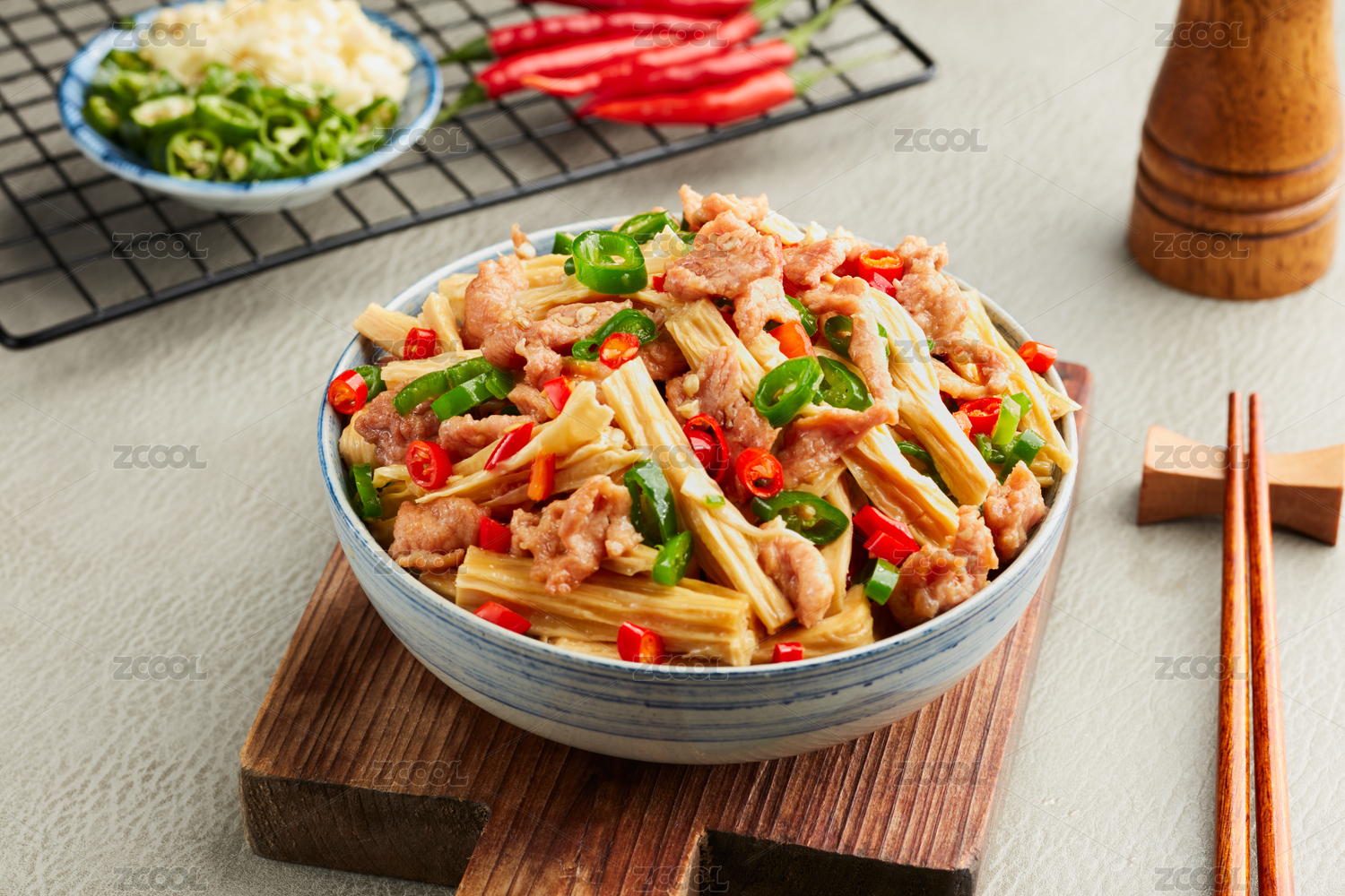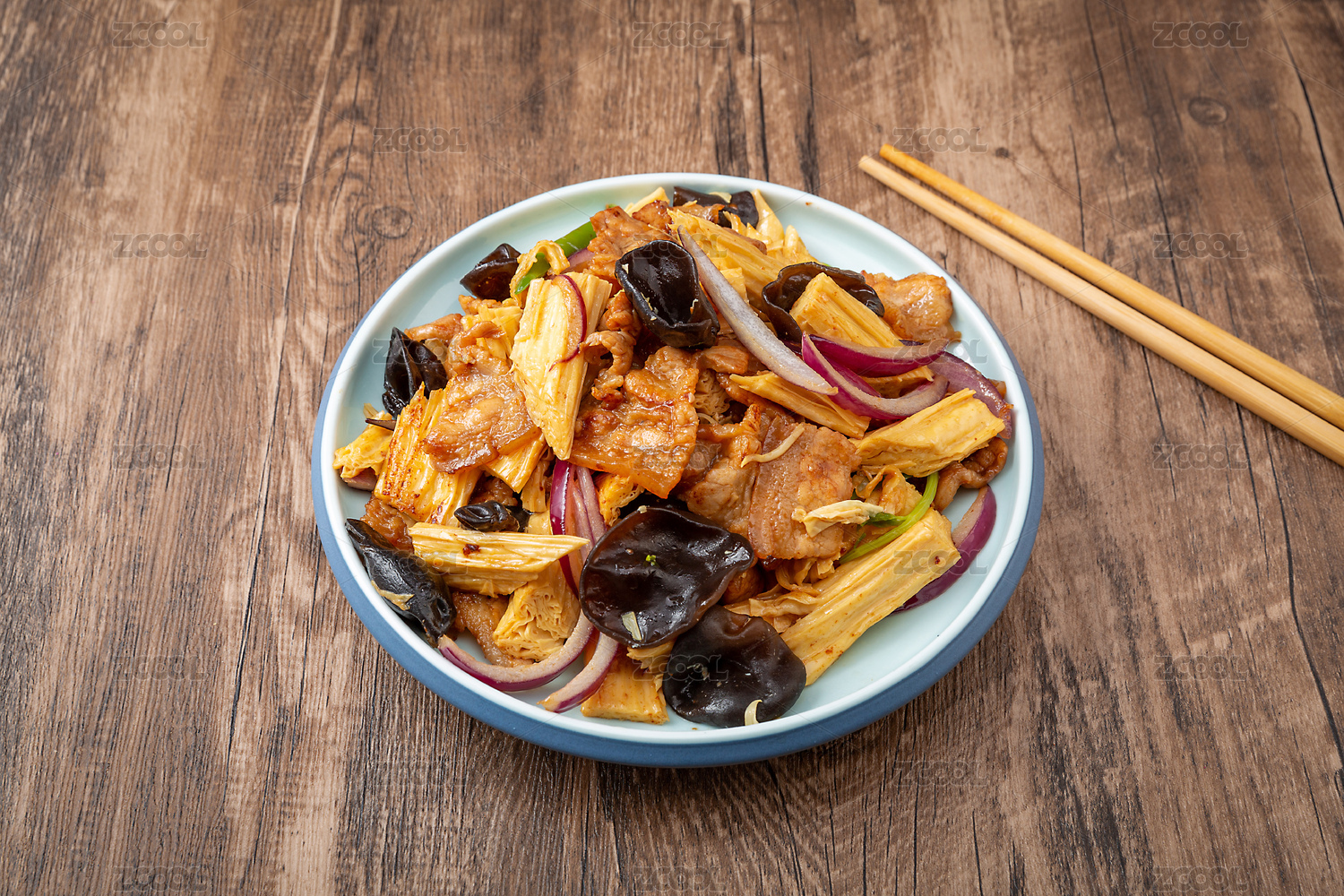 木桌背景傳統(tǒng)客家美食腐竹炒肉