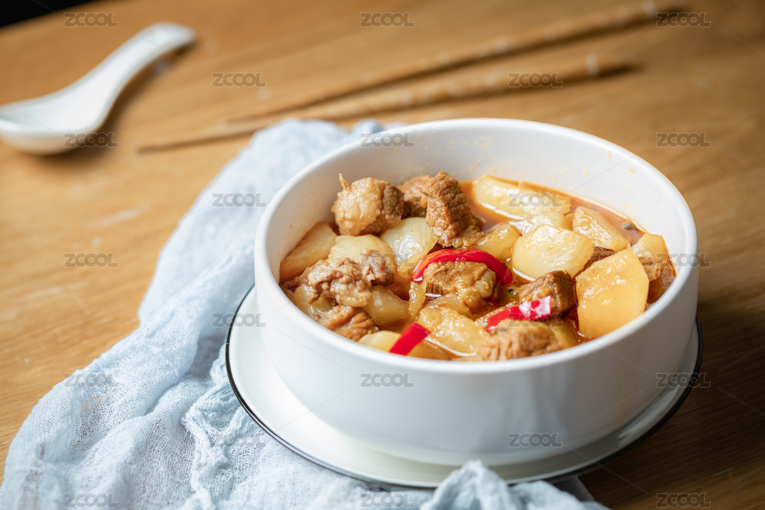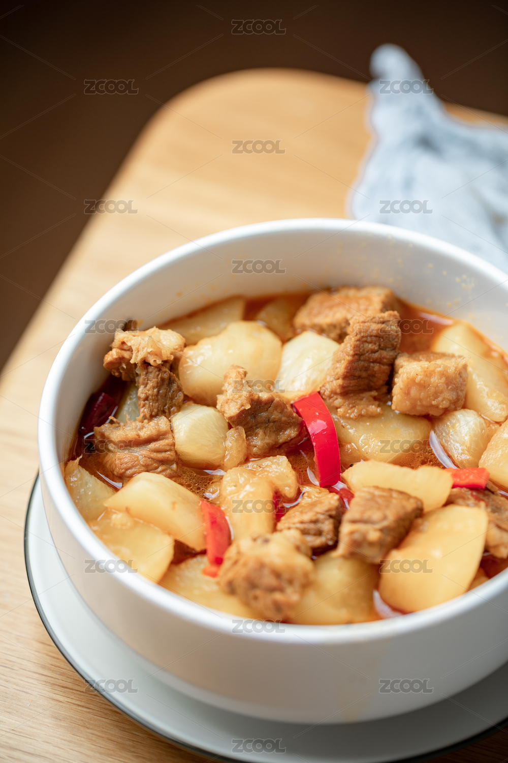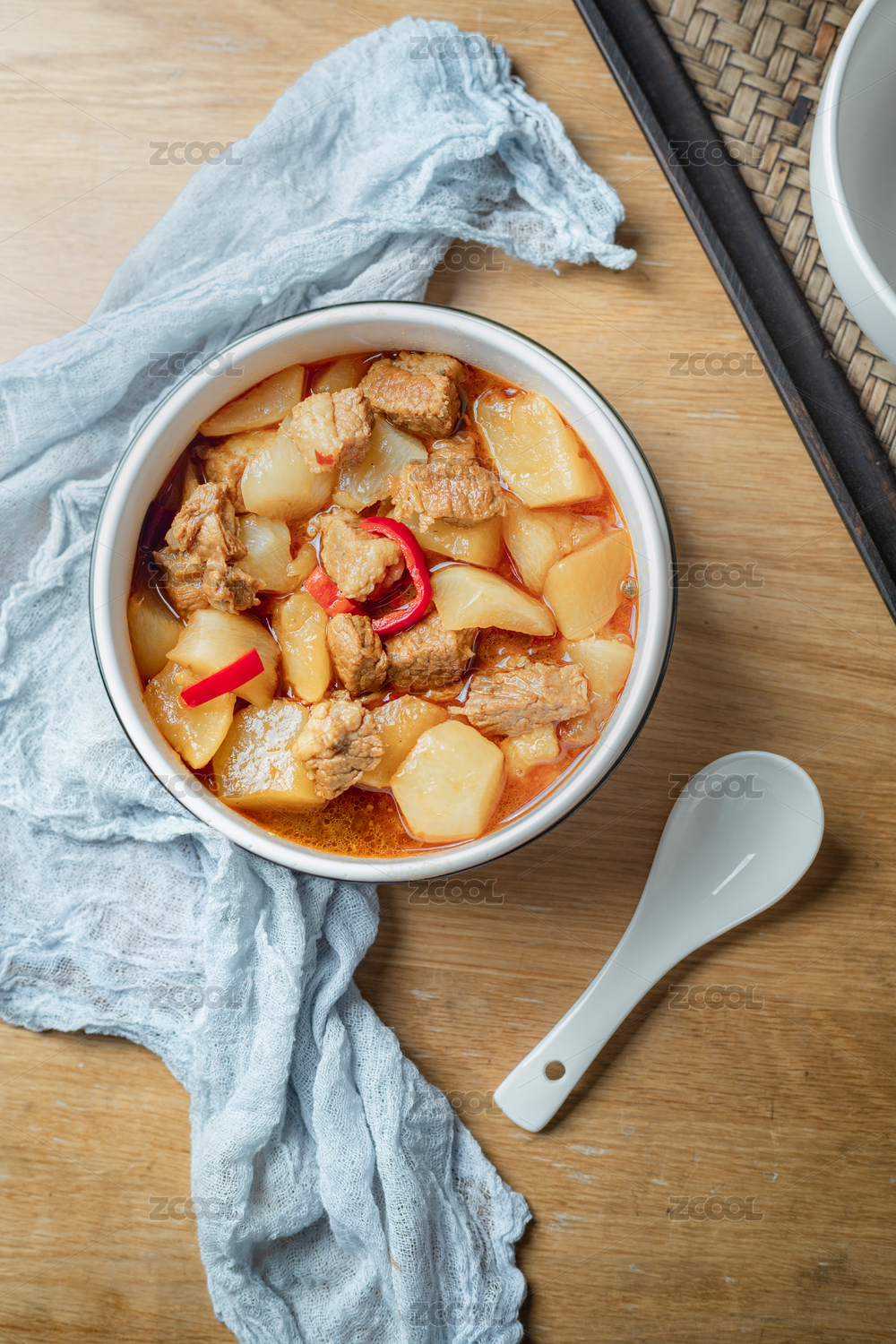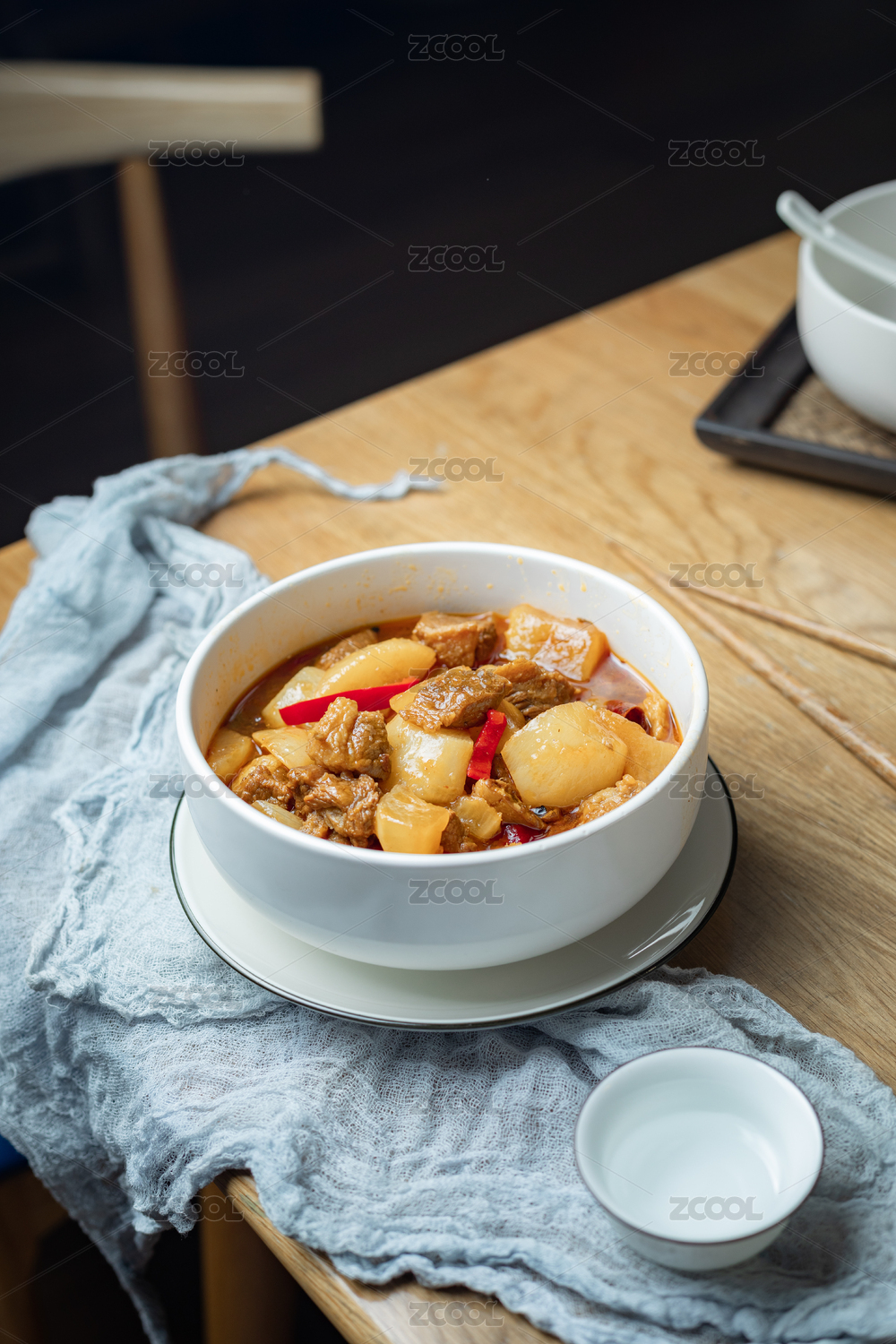 餐桌上碗里的辣椒牛腩燉蘿卜