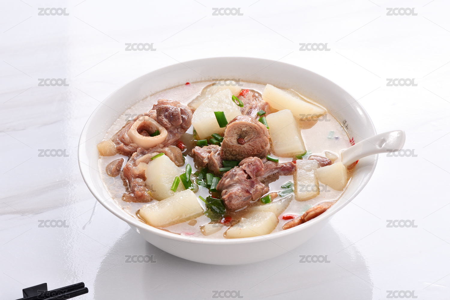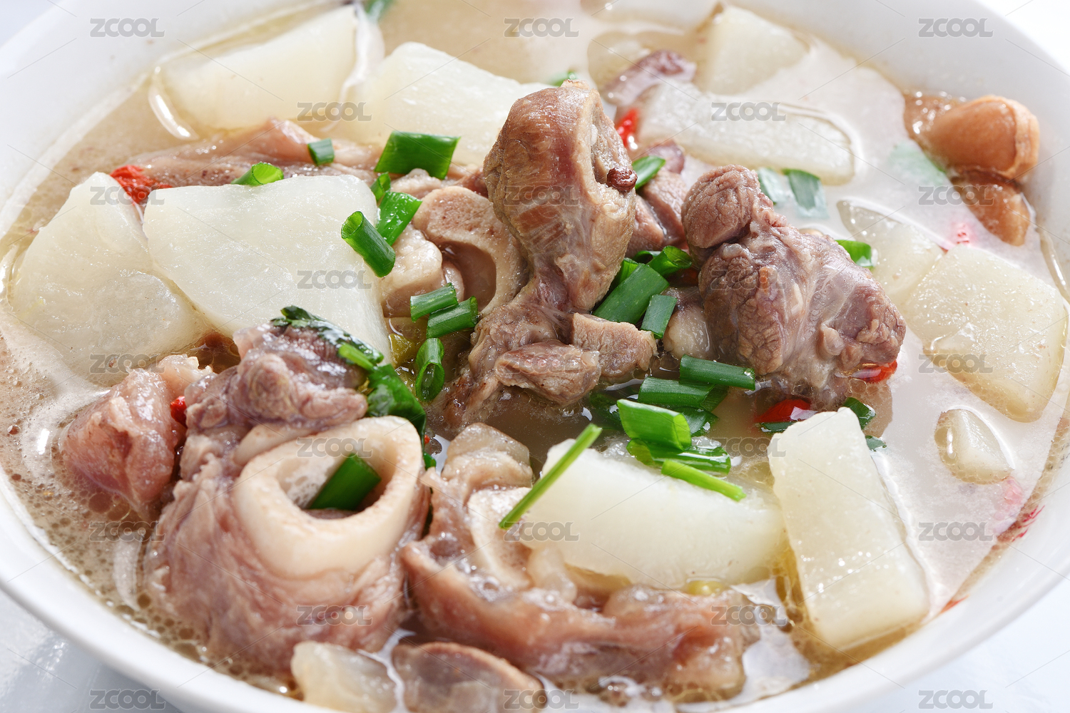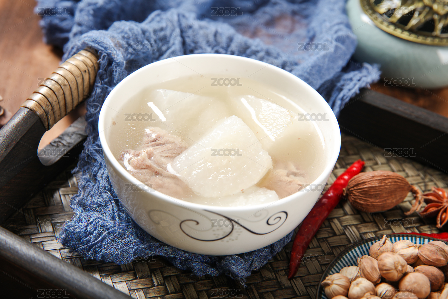 裝在圓形大碗里的肉骨燉蘿卜豆腐湯