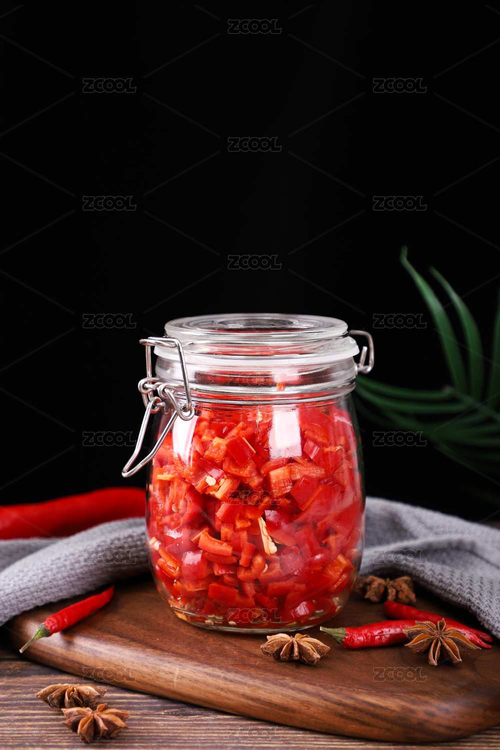 黑白背景下腌制食材的玻璃罐