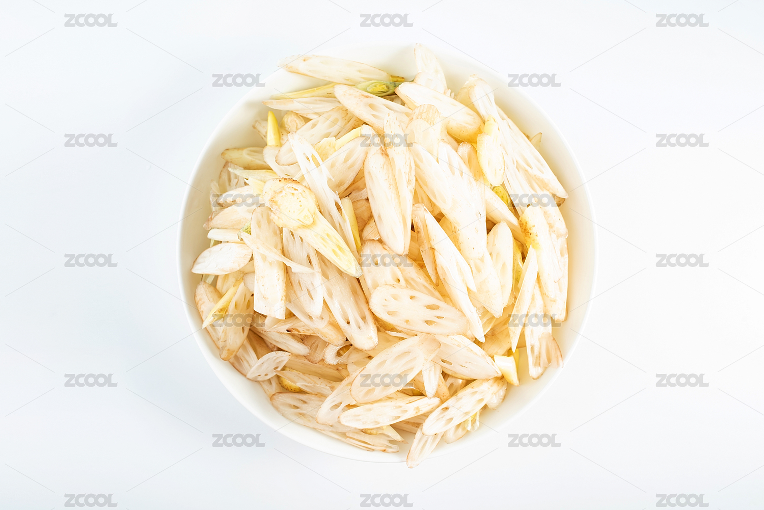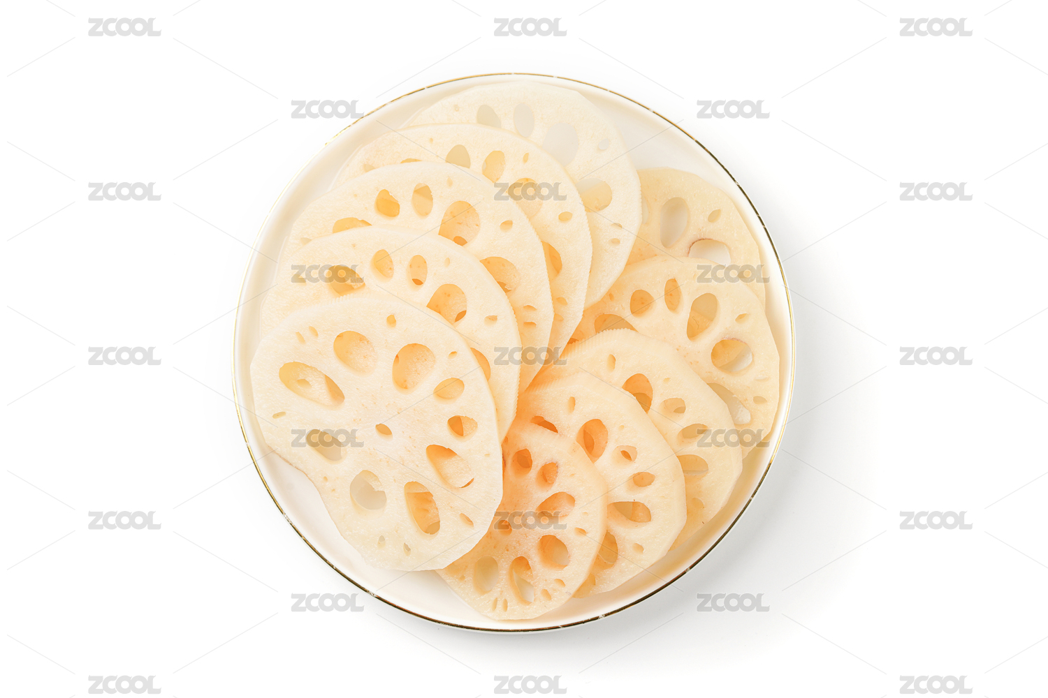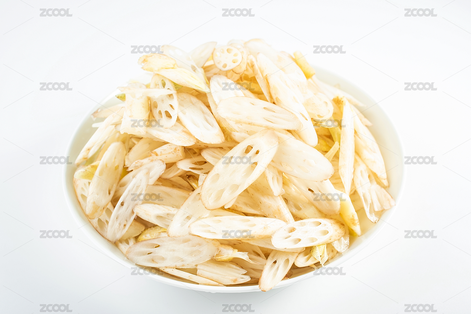 一碟新鮮藕帶切片在白背景上