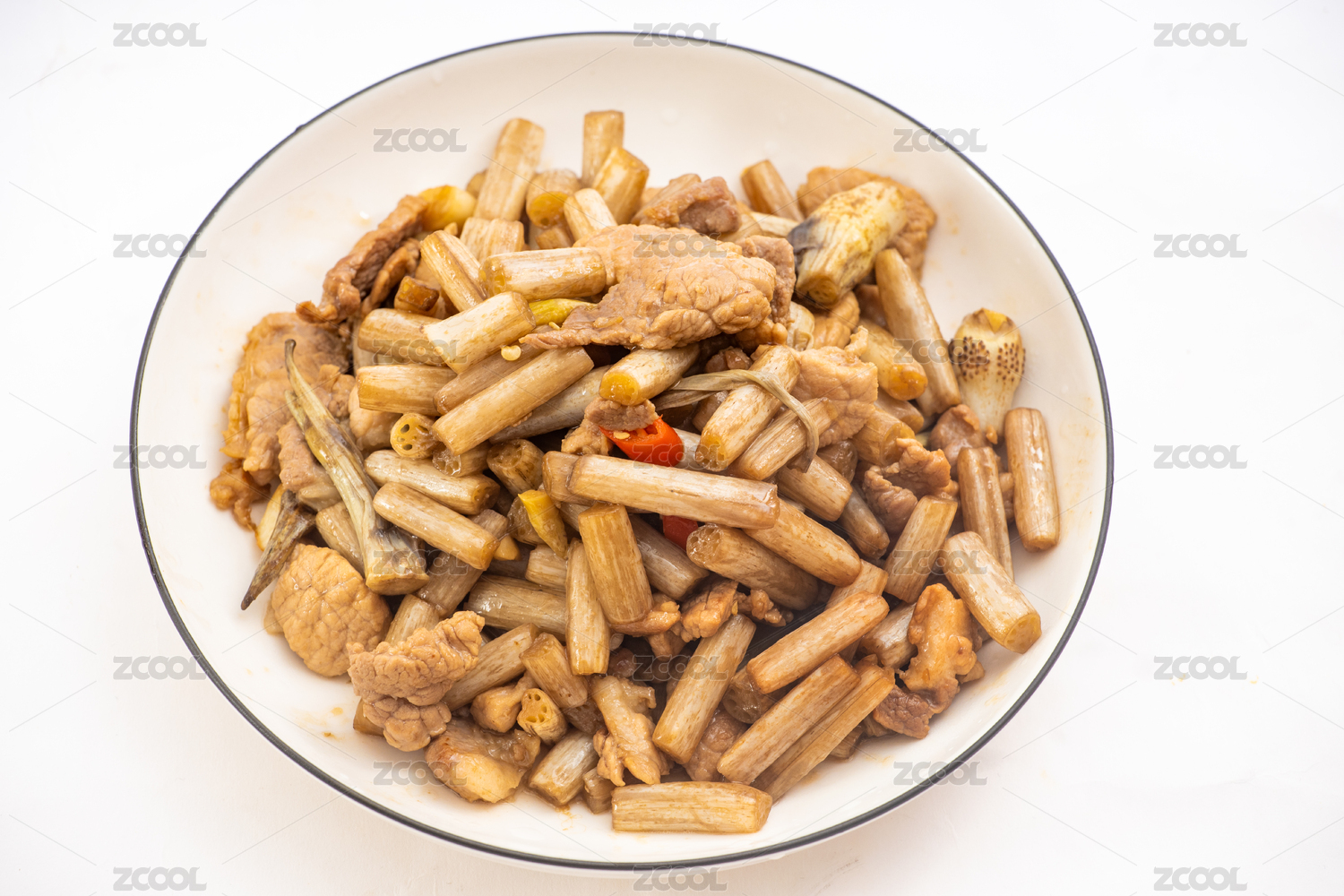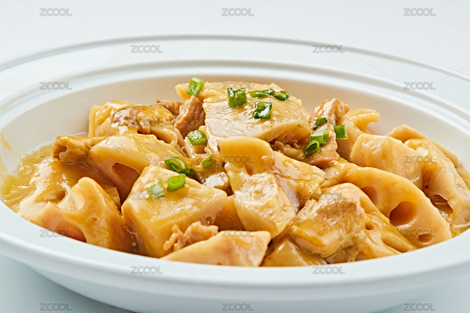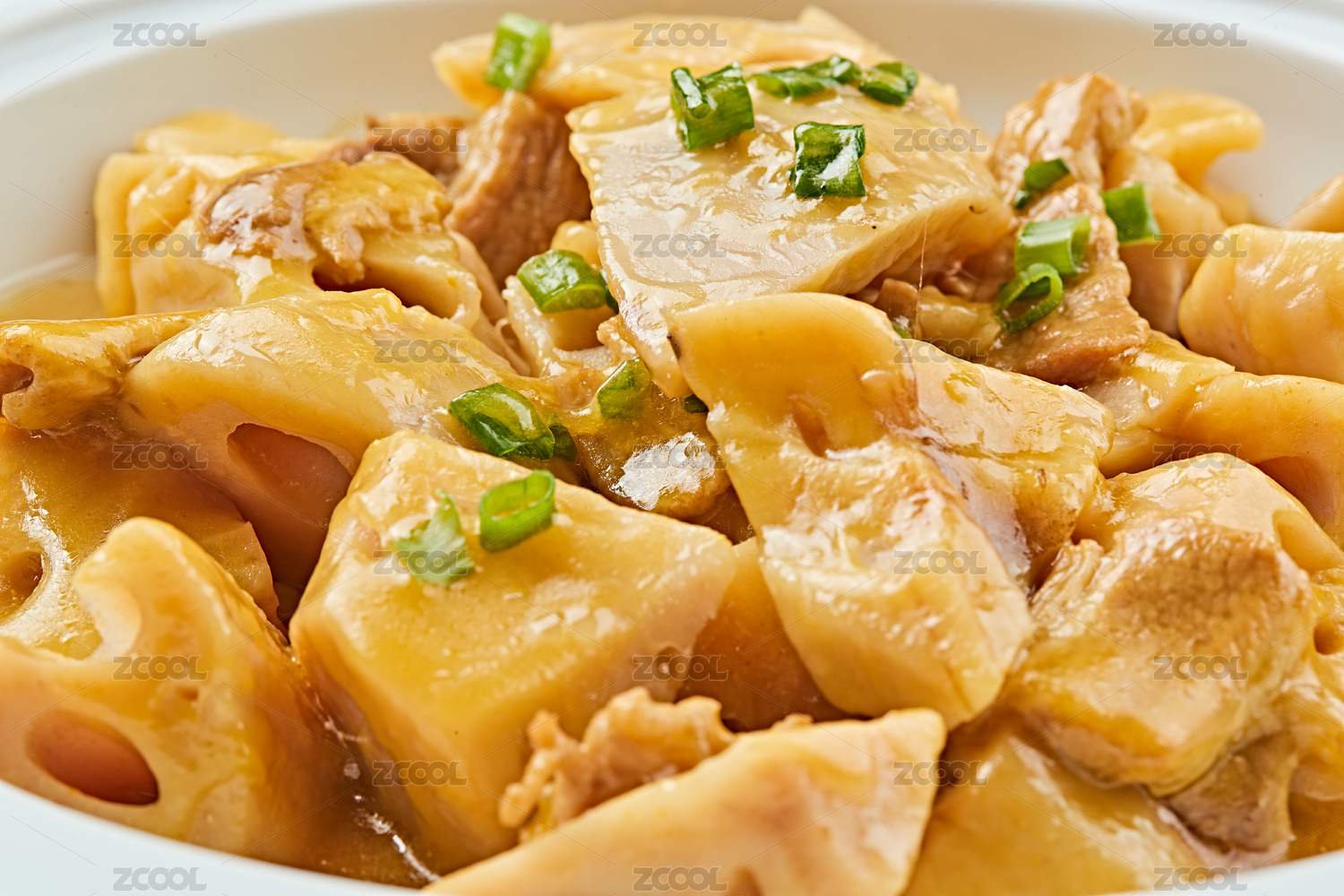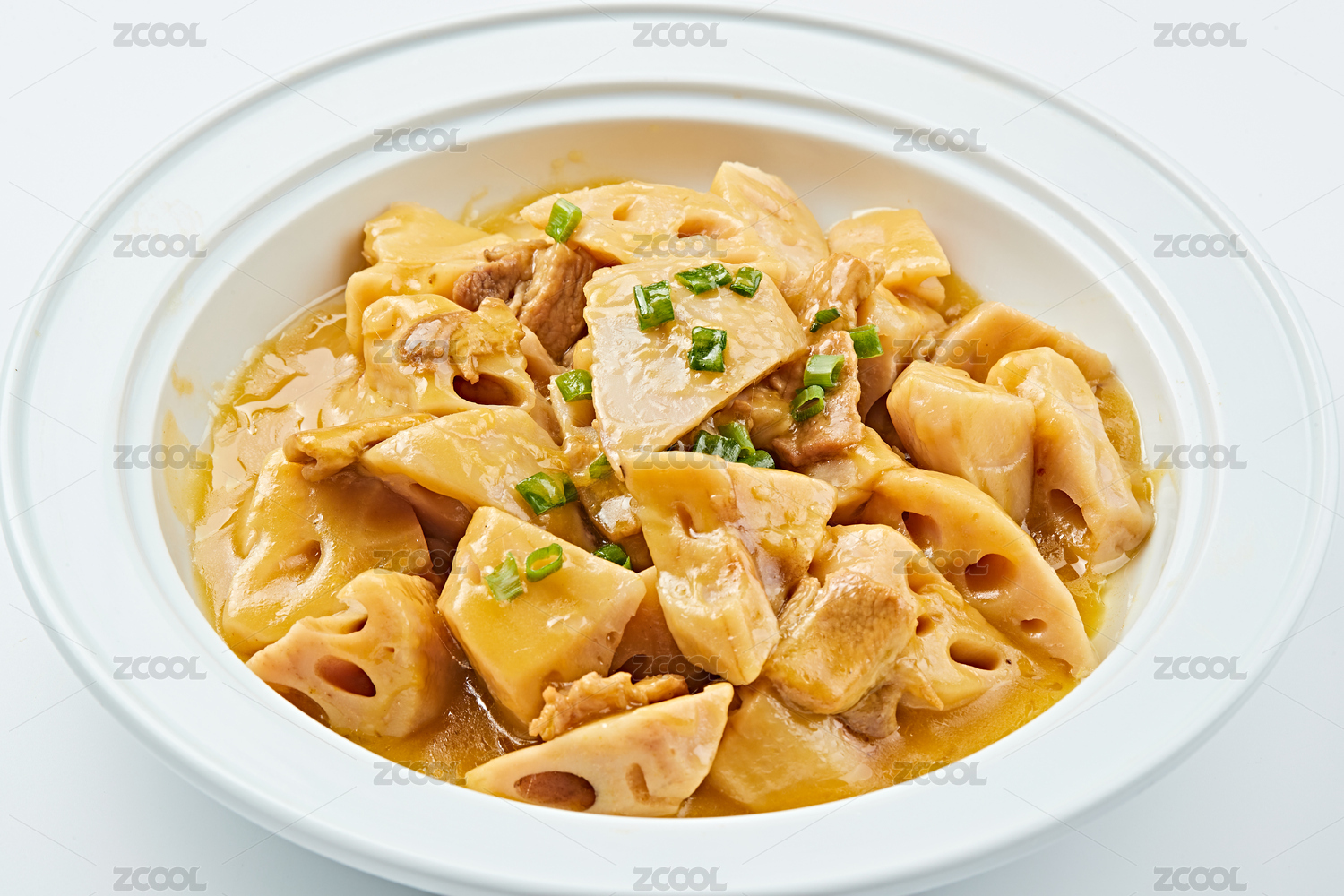 白色瓷盤裝的農(nóng)家五花肉燉鮮藕