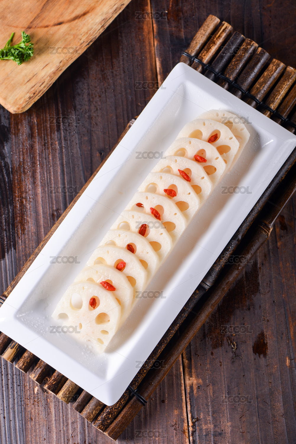 一盤新鮮藕片放在竹板上