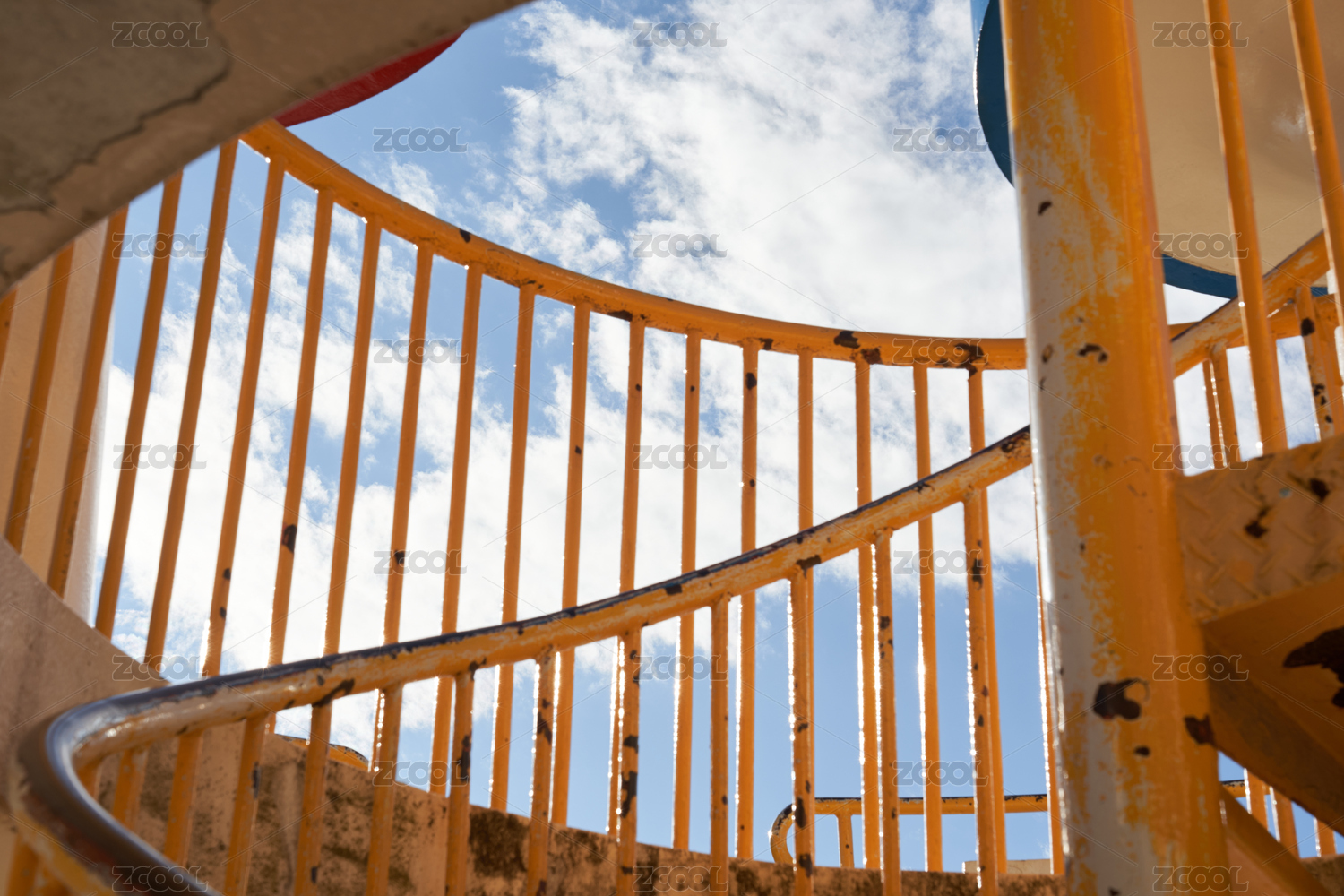 藍天白云下陳舊的黃色扶梯