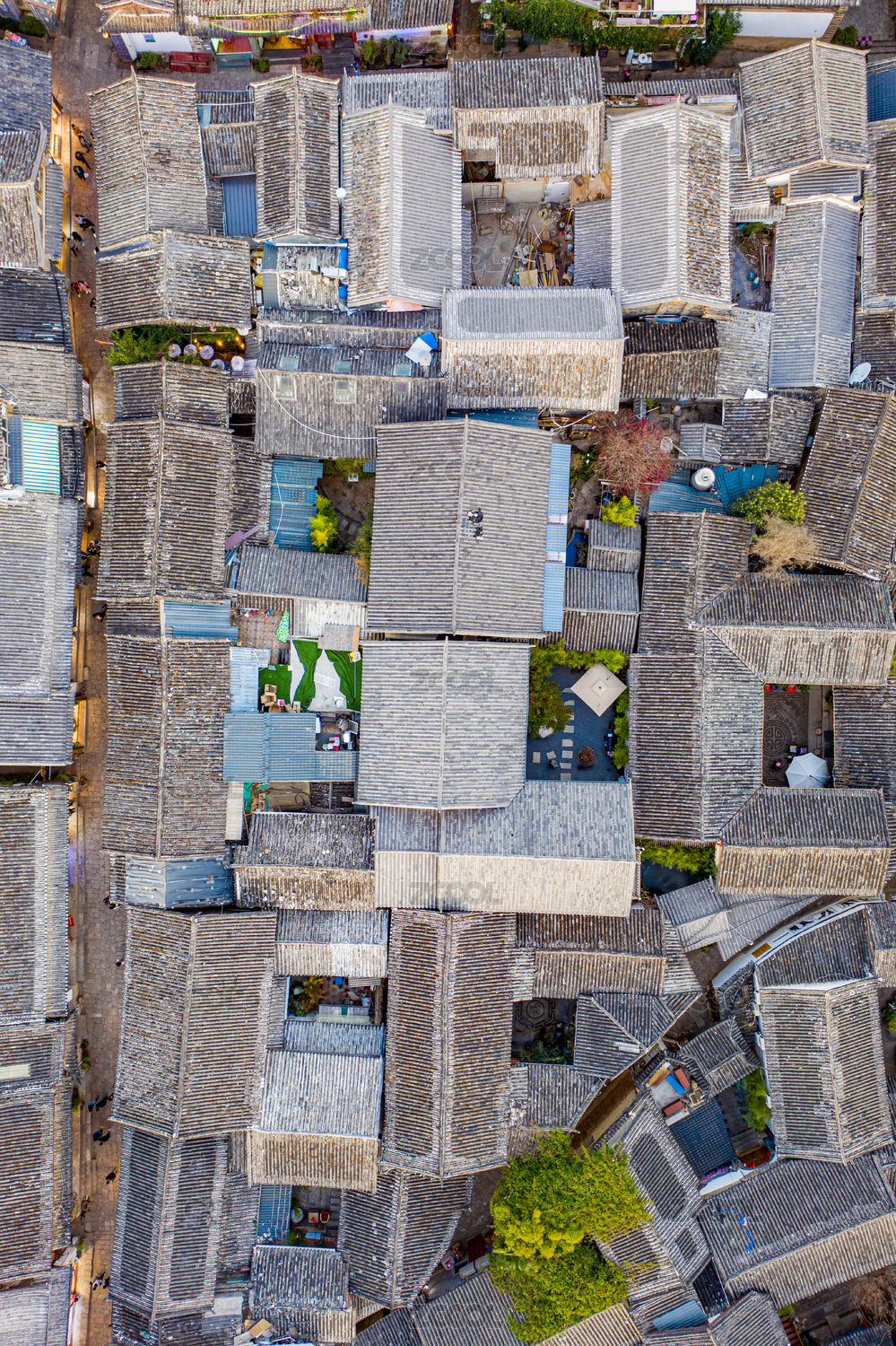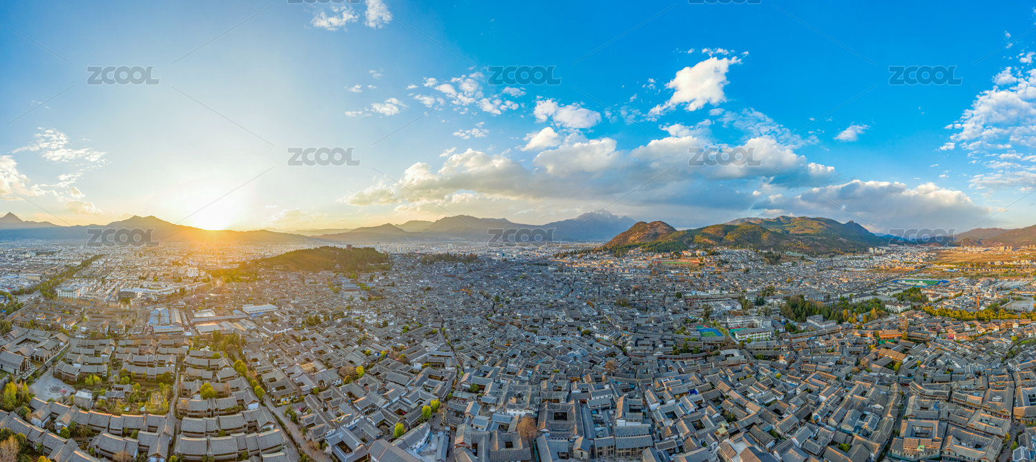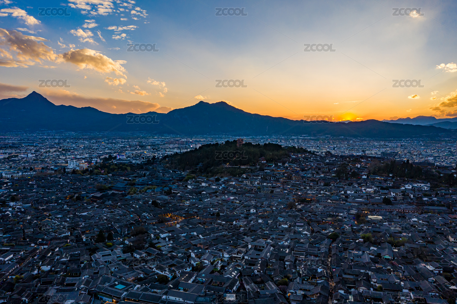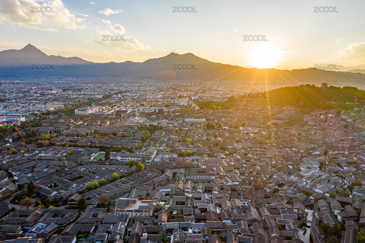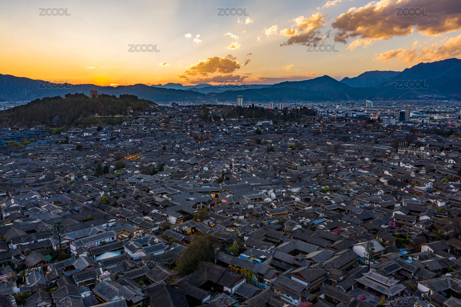 航拍云南麗江古城黃昏落日夕陽金光映照古鎮(zhèn)